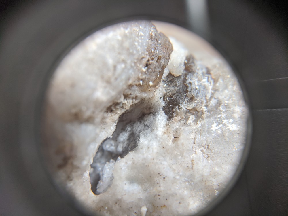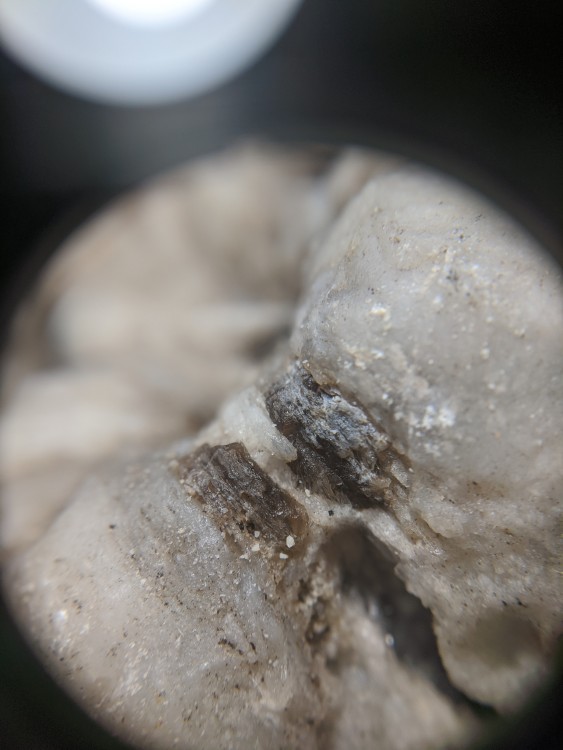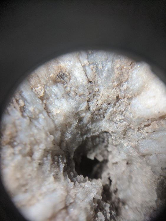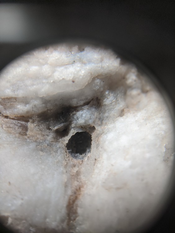 Il ne me semble pas que le bain n'ait fait apparaître grand chose, mais le spécimen est tout de même un peu plus propre. Voici quelques nouvelles photos prises au grossissement x10 : Photos des cloisons couleur fumée semi-transparentes ou blanches semi-transparentes: Photos du centre creux de certains polypes (la plupart sont bouchés): Avec le centre bouché: Intérieur d'une cloison brisée Minéralisation dans des crevasses : Voila à peu près tout ce que je suis capable de dire Merci d'avance :) -