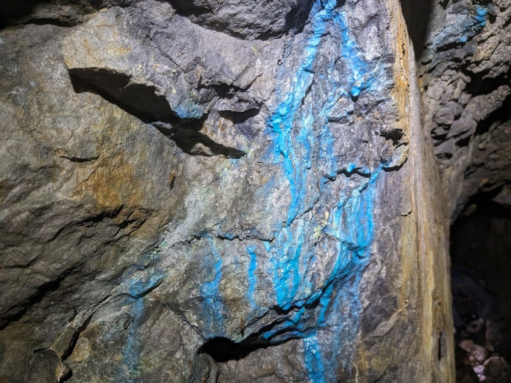 Salut, j'aimerai avoir votre avis sur la composition et surtout sur la méthode de formation de ces coulées d'un bleu très vif. Trouvées dans une mine dont la caisse filonienne se compose d'une masse quartzeuse au sein de laquelle se trouve un broyage argileux minéralisé en blende, galène, azurite et malachite. Localement la gangue est presque exclusivement barytique. Certaines zones renferment de très nombreux cristaux de fluorine (blanche, verte et violette). Il semble s'agir d'un oxyde de cuivre. La mine a entre 150 et 250 ans, en combien de temps ces formations peuvent-elles se créer ? Merci d'avance pour vos réponses 🙂