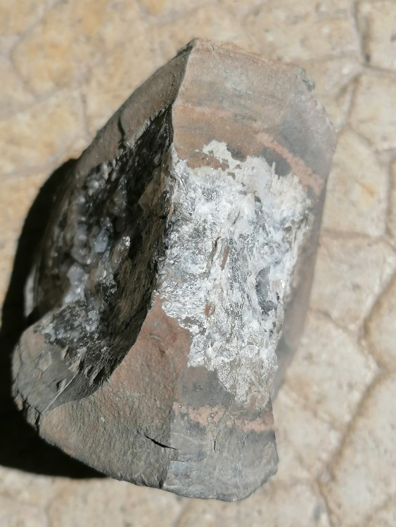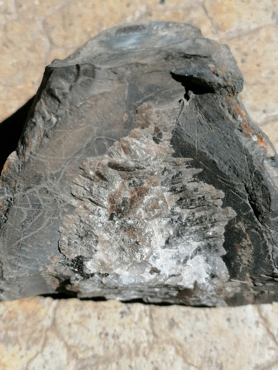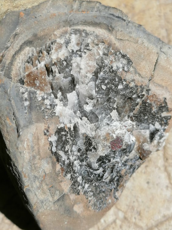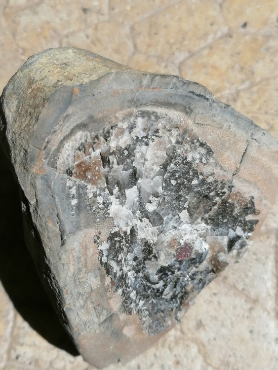 Bonjour à tous, j'ai besoin de votre aide précieuse pour identifier un caillou que j'ai trouvé dans des strates du callovien, j'ai cassé un caillou ovale de type nodule ou septaria de calcaire, l'intérieur est cristallisé par de la calcite j'ai l'impression avec petit bout de nodule de marcasite, est ce bien cela ? Quel est cette cristallisation noirâtre également ? Marcasite ? Puis je trouver un fossile à l'intérieur si je le recasse ? Merci d'avance