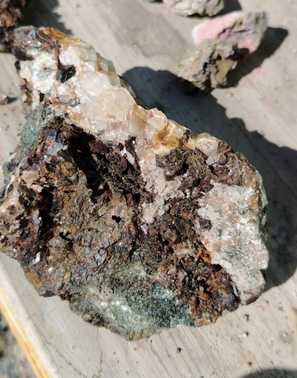 bonjour, merci @AMEDE et @gryph58 voici quelques axinites nettoyées, les plus belles pièces que j'ai postées dimanche, sont recouvertes d'un encroutement noir, voir très épais, d' oxydes et carbonates, peut-être asbolane, mais compliquées à nettoyer...en les mettant a tremper dans l'eau, elles ont dégagées un nuage noir, mais ce n'est pas pour autant que j'ai pu les ravoir au pistolet. Si vous avez une solution, merci d'avance. 1-celle ci fait 17 cm avec un peu de chrysocolle et un encroutement verdâtre inconnu, bon, elle m'a l'air un peu altérée cette axinite, non? 2-une pièce de même taille avec calcite et quartz VID_20250916_123812_809.mp4 VID_20250916_163434.mp4 3-des échantillons plus petits, moins "encroutés" 4- 5- 6-plusieurs pièces de Cobaltite, petits cristaux et aussi plus massive, VID_20250916_183051.mp4 Epaisseur d'un bon centimètre, faite d'amalgame de cristaux, 7- 8- 9- celle-ci a le cristal le plus grand, 5/6 mm