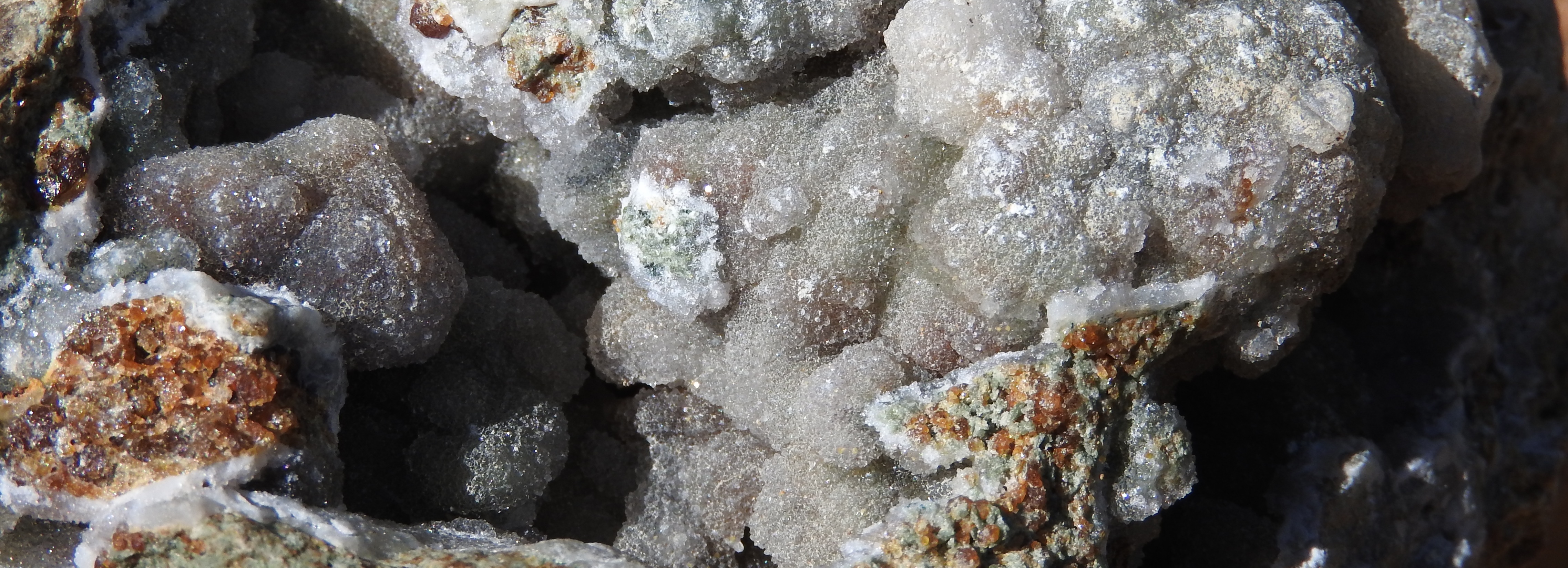 23. 09/06/2017 salut, retour sur Ovalle, sur le lieux des grenats andradites, ici après les pluies, le désert s'explose de vert, les départementales s'explosent tout court, * enfin, voilà les trouvailles, 1- une autre calcédoine, détail, 2- et celle-ci , mica ou hématite ? détails, 3- une petite géode de calcite, et mon "best of" de la journée, 4- géode et calcédoine, détails, 5- une plaque couverte, pas trouvé plus grand, détails, 6- les plus gros, les plus noirs, les plus opaques, les moins nettoyés, mais j' 7- un autre dans son jus, 8- 9-plus petit mais non moins sympa, détails, 10- les plus petits gros, 11- et pour finir, fin de journée sur la cordillera de la costa, je vais même rester.