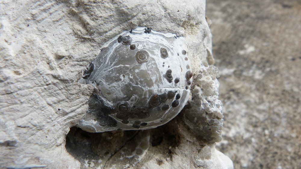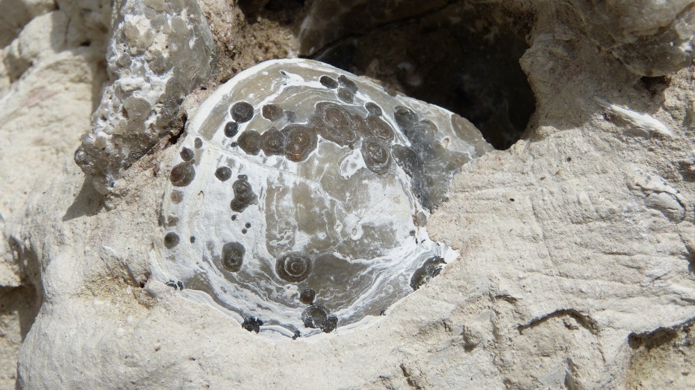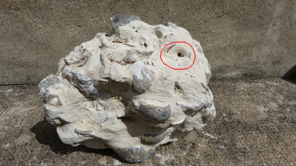 Bloc calcaire trouvé dans du "Campanien" en Dordogne. Un fossile de "Trochus" entouré en rouge et une multitude de variétés d' "Huîtres" que je ne sais pas identifier. Ce ne sont pas des "Gryphaea", j'en suis sûr, ni des "Pycnodontes", mais alors, que sont-elles ? Merci d'avance aux spécialistes qui pourront me donner leur avis. -
