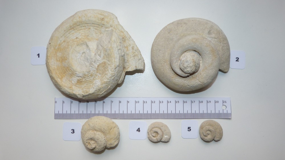 L'ensemble a été trouvé en Dordogne, dans un terrain appartenant au Campanien d'après les informations de la base d'InfoTerre. J'aurais aimé avoir l'avis des spécialistes du forum pour pouvoir donner un nom plus précis à ces gastéropodes, le n° 1 étant différent des 4 autres. Est-ce que ce sont des "Pleurotomaria" ou bien ...? Dans l'attente "anxieuse" de réponses, je vous remercie par avance.