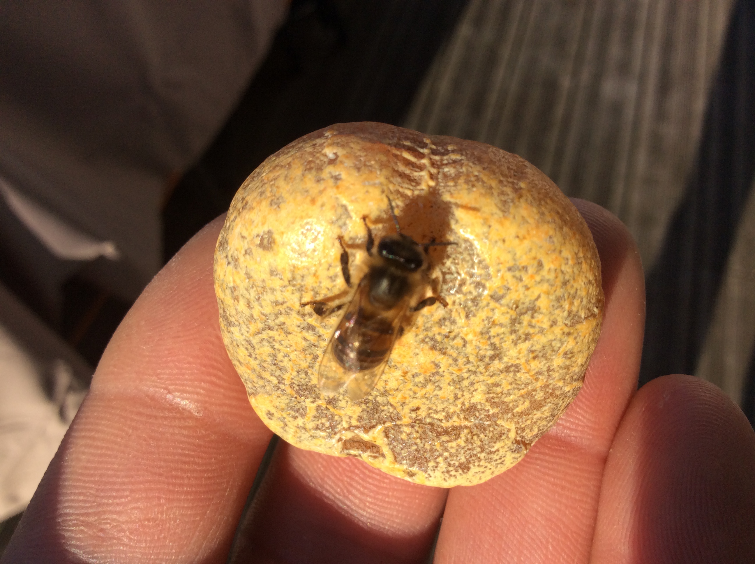 Pour ma part, le corps d'un crabe silicifié. + une abeille qui a pris mon fossile pour une fleur. Si quelqu'un connaît le petit nom du crustacé, ça m'intéresse. -