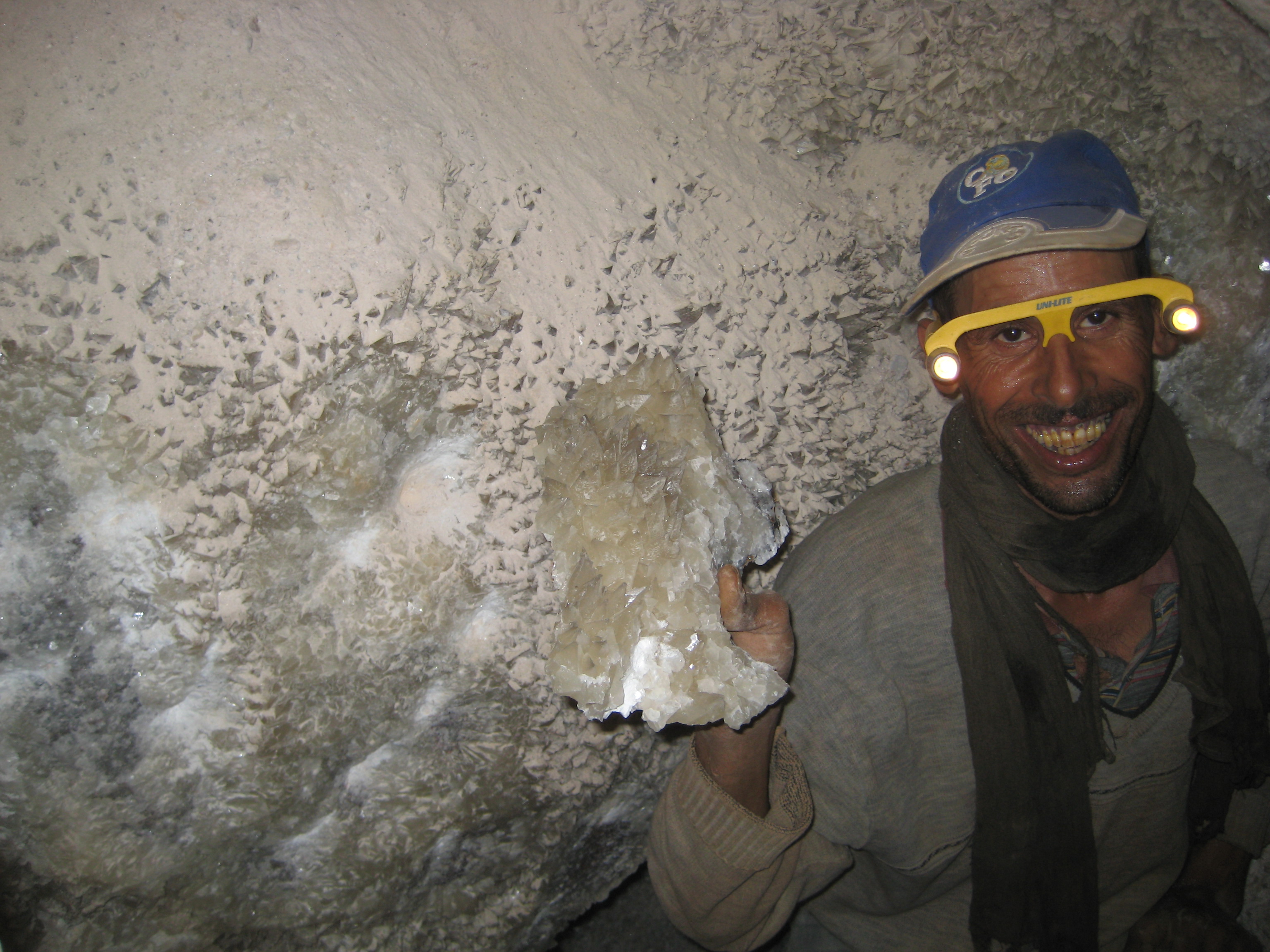 Salut géode calcite Irhound Maroc 3 m sur 2 m sur 2.50 .Moi je n'ai pu passer la tête par le trou mais le bras avé l'appareil photo.Il ma sorti cette pièce.la 1ere photo ce n'est pas le bon trou ,l'autre était moitié moins grand ont a tiré le mineur par les bras pour le sortir.A+ Djems