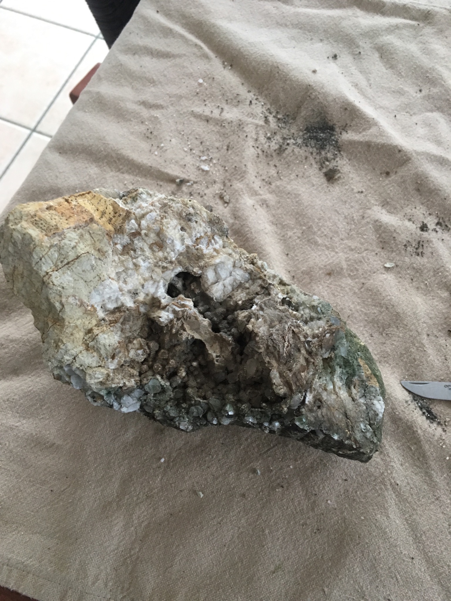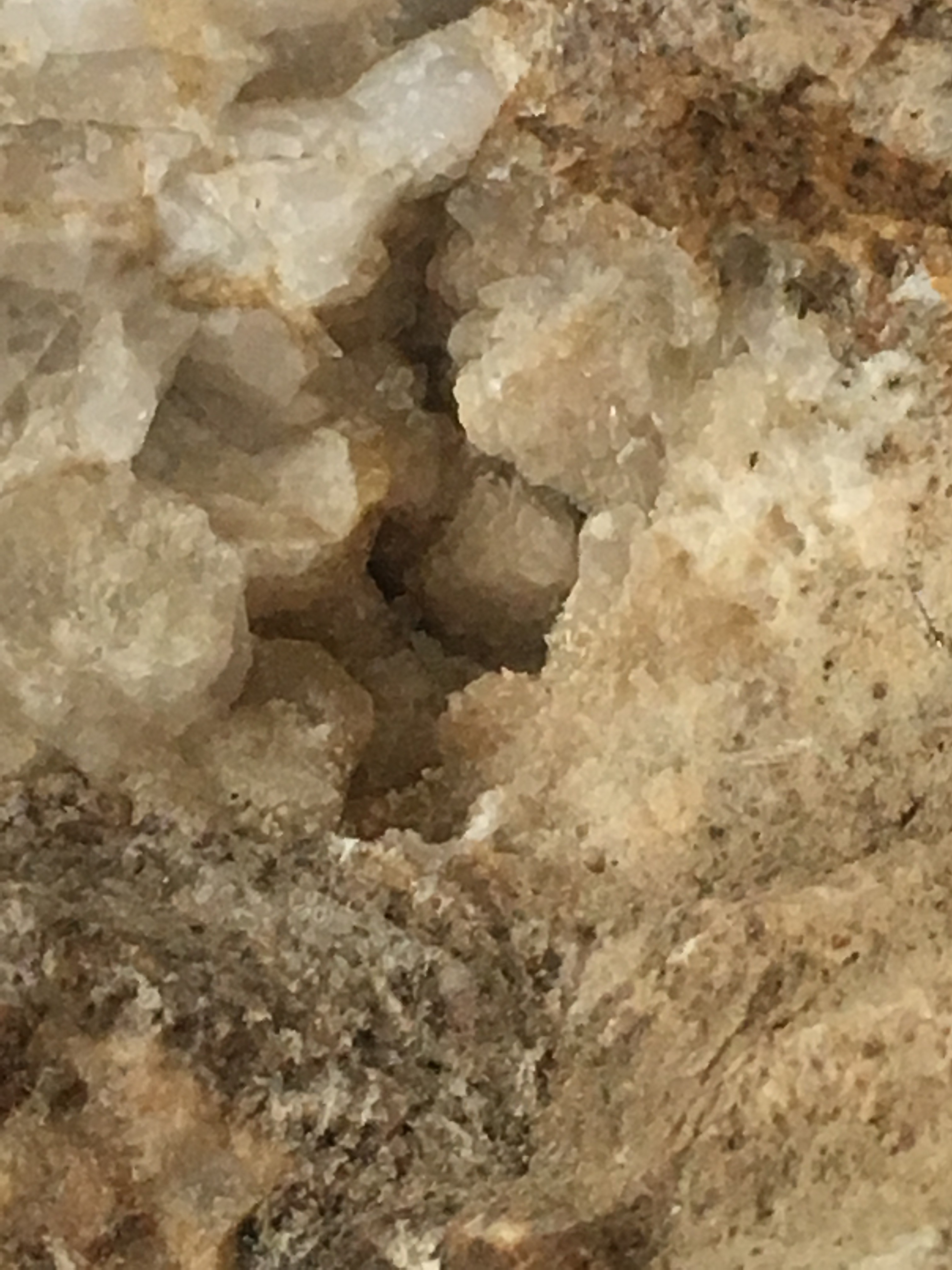 Enfin, sur la dernière photo, c'est ce que j'ai remarqué de l'autre coté de la pierre, encore de la "calcédoine"! J'ai observer ce creux attentivement et j'ai vu qu'il y avait une sorte tunnel qui reliait cette partie de la pierre avec la première. Penser-vous que ça vaut le coup de casser la pierre de ce coté pour découvrir ce fameux "tunnel"?