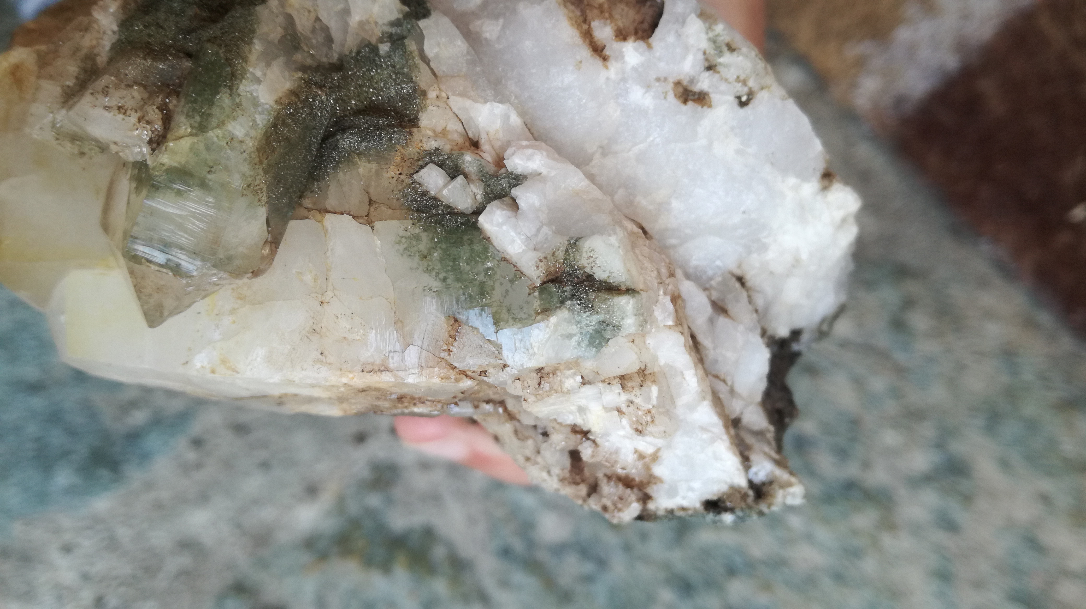 Ensuite, cet agrégat vert/gris brillant sur quartz, qui a d'ailleurs créé des inclusions (j'espère que les photos seront de bonne qualité, j'ai essayé de prendre à l'ombre/soleil, sec/mouillé)
