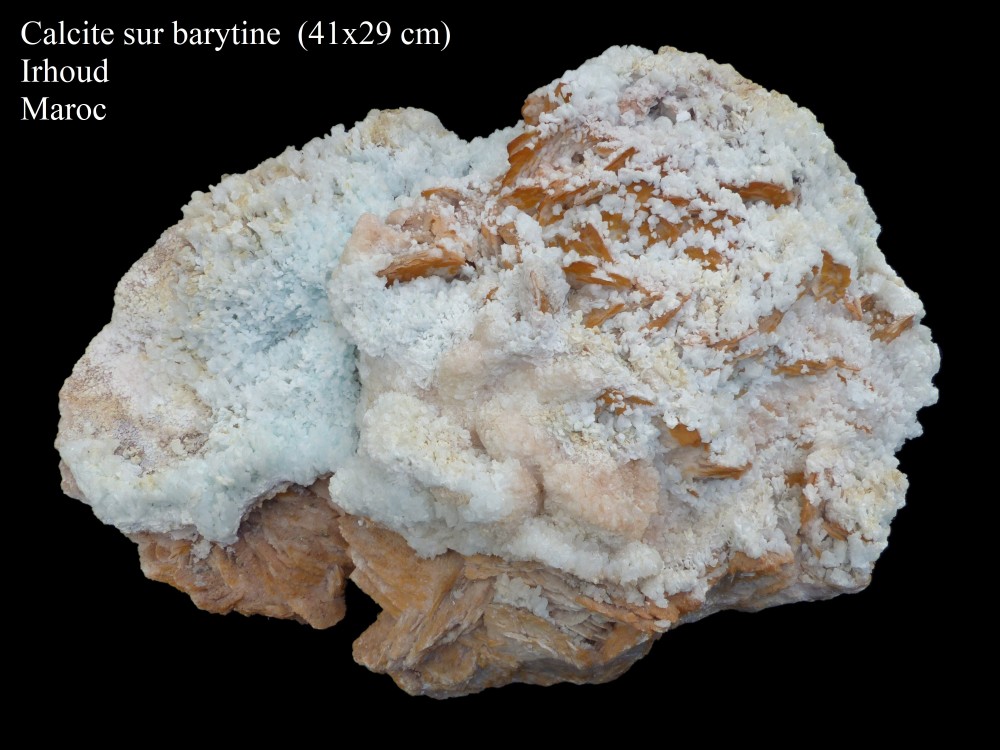 Bonjour, une petite pièce récupérée récemment calcite sur barytine d'Irhoud, on peut noter une teinte verte d'une partie de la calcite du à la présence de minéraux de cuivre. à plus ............... -