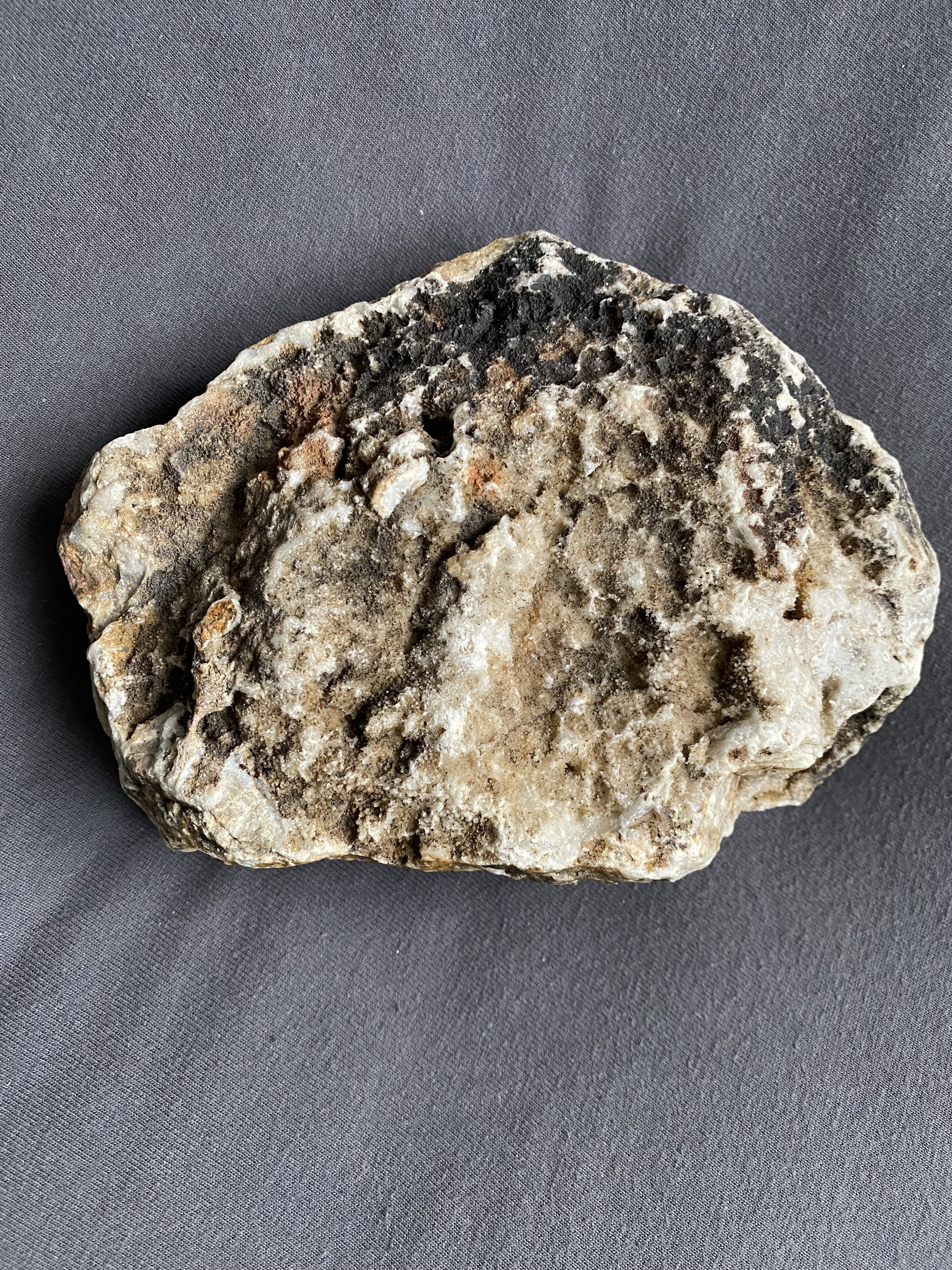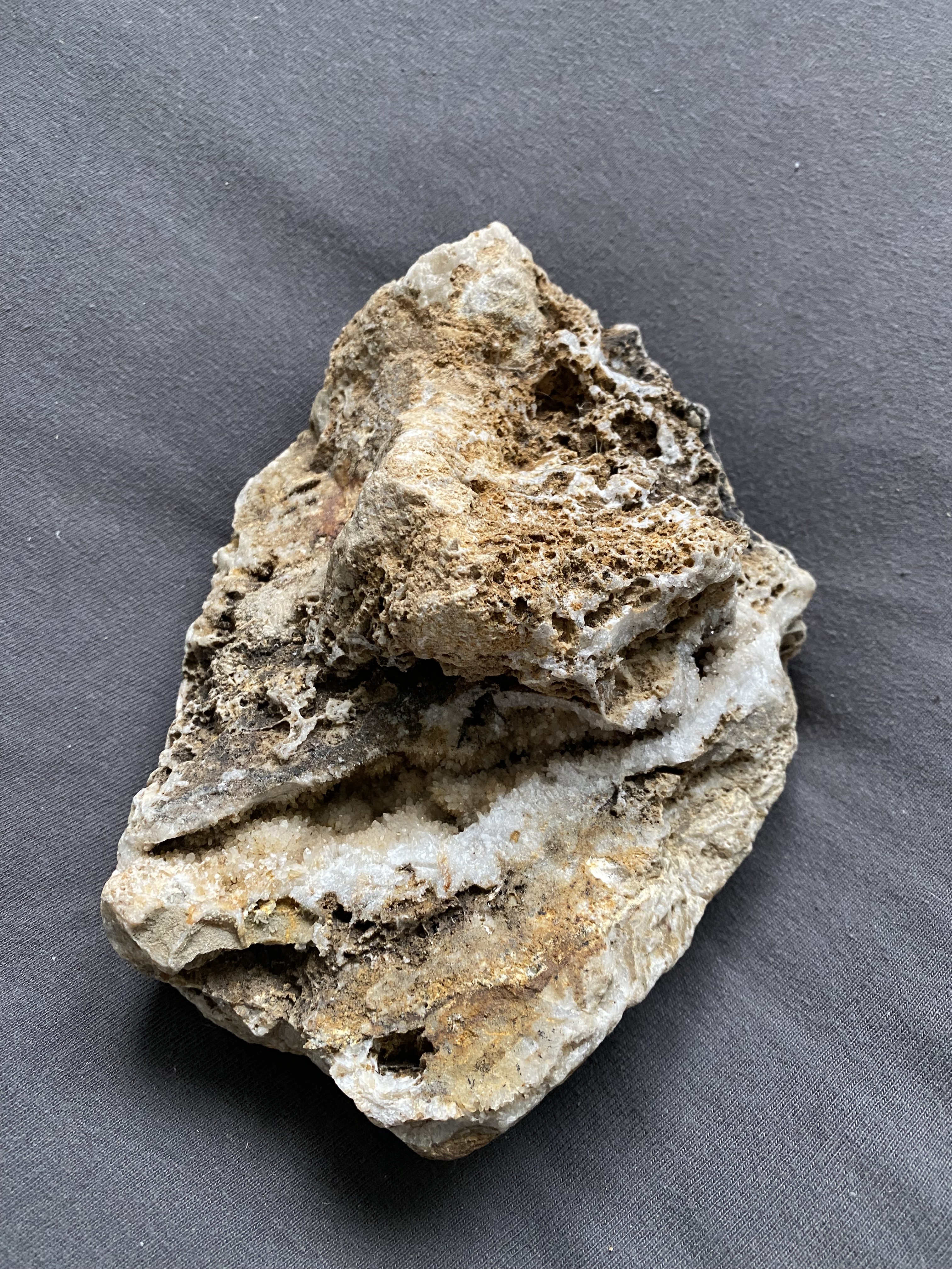 C'est pourquoi, je cherche à faire examiner une roche (qui ressemble beaucoup à du calcaire) traversé par une veine de quartz (supposition) principale sur le dessus. Le dessous de la roche est un lit de plein de petit cristaux malheureusement très sale du fait de la provenance (peut être nettoyable avec un bac à ultra sons).