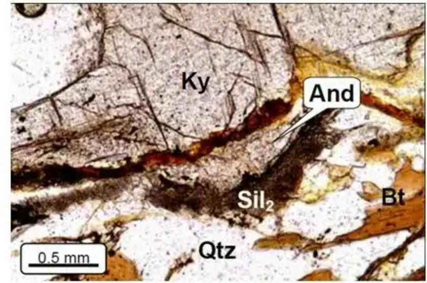 photo 02: lame mince d'une roche métapélite les cristaux en blanc sont du QZ et des plagioclases et le mineral marron de la biotite, présence aussi Ky et sill, suggérant une réaction : Ky + plg <-----> Sill+bt + Qz