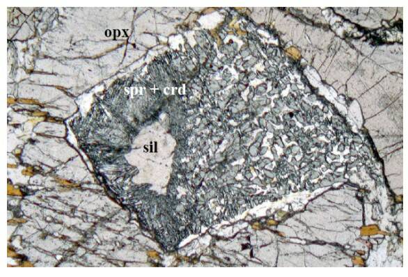 photo 03: une lame mince montrant la présence D'opx , spr, crd et sill suggérant la réaction Crd+ spr <------> sill+opx