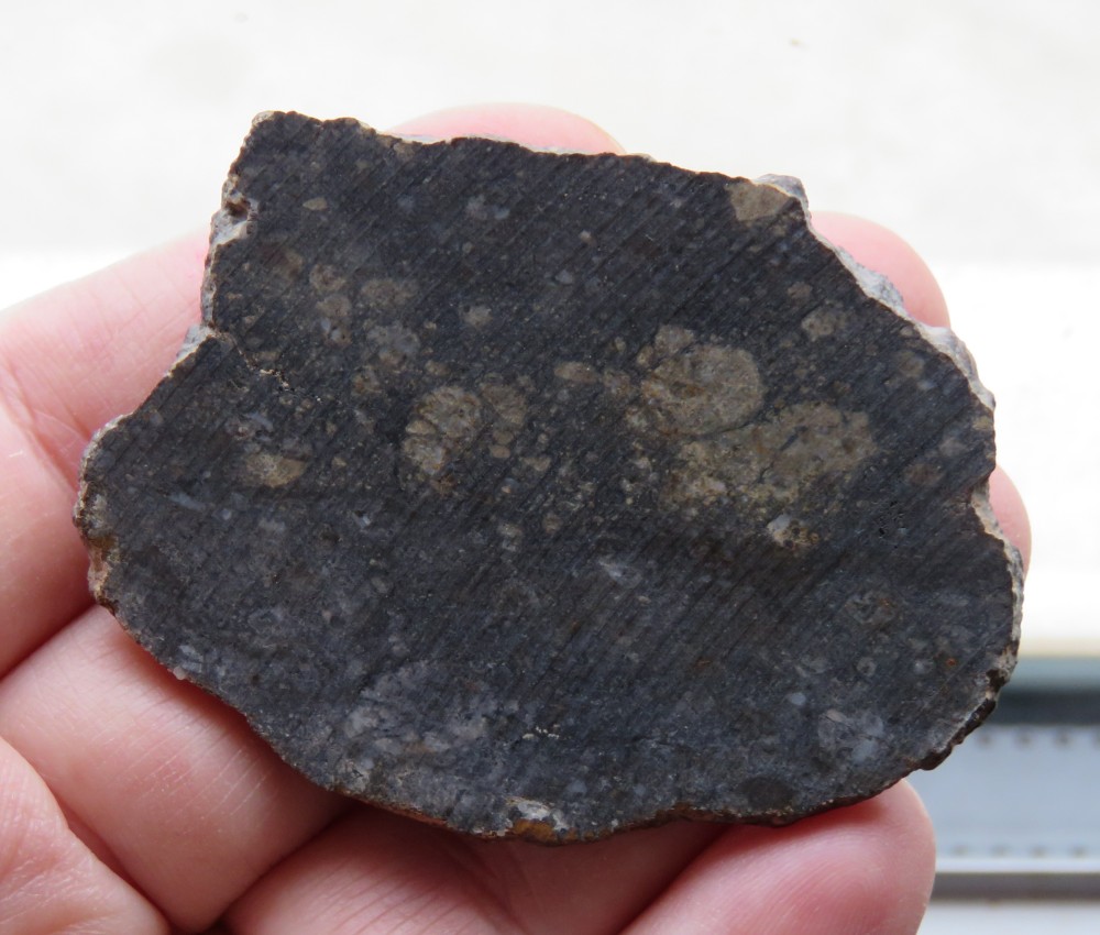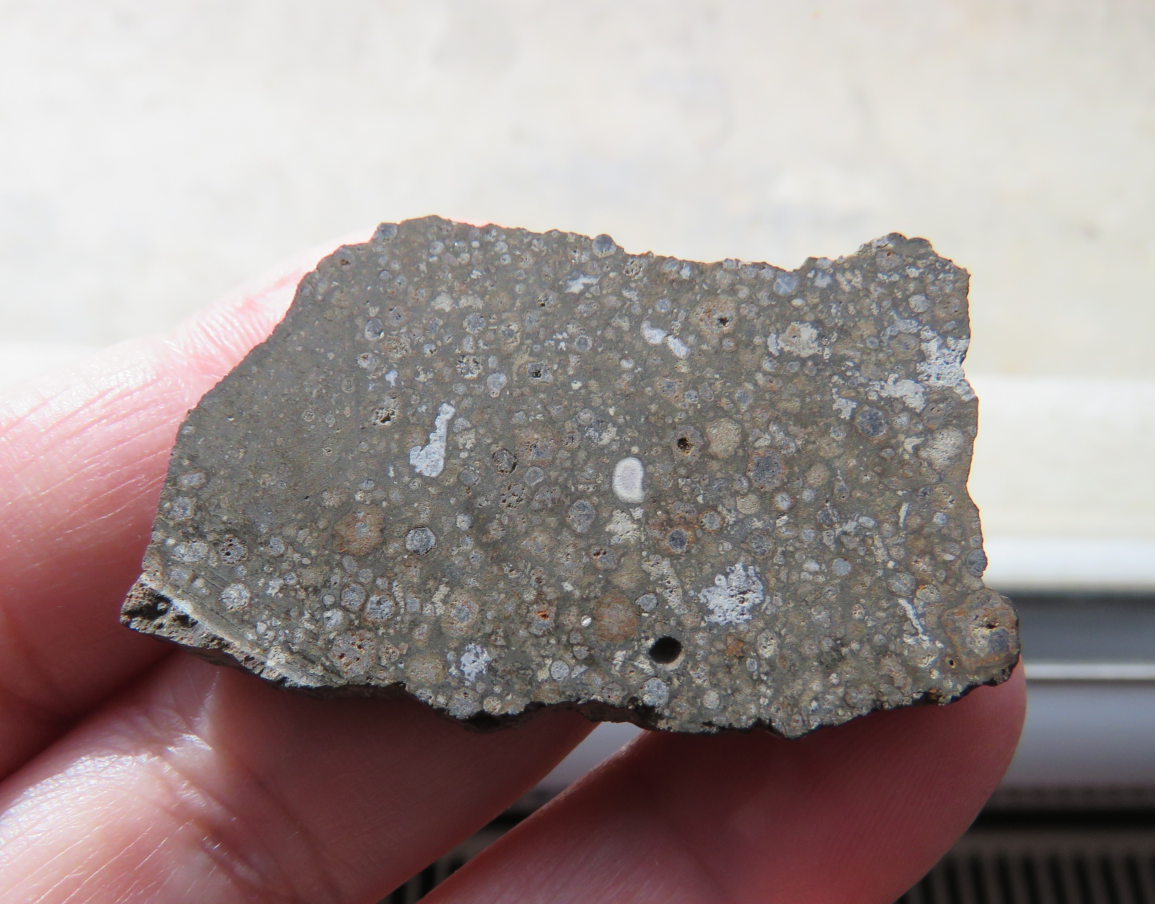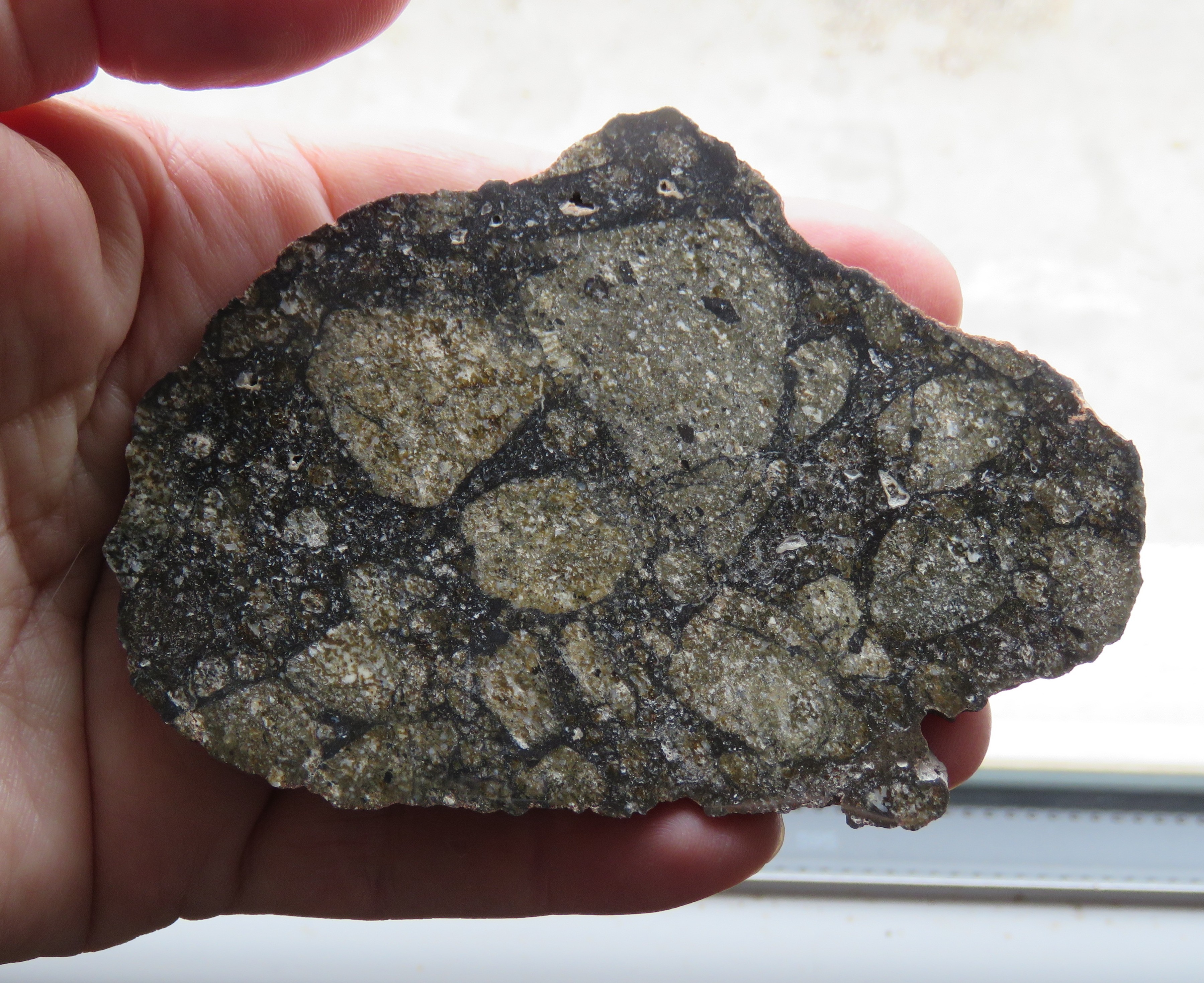 Une lithologie intéressante et peu commune: "grand" claste sombre de type CM2 (Cf Murchison) à l'intérieur d'une CV3 autrement bien classique, NWA 2086: Sur la page dédiée du Meteoritical Bulletin, peu d'infos précises comme souvent en ces années-là (2003) sinon qu'elle est peu altérée (W1) et peu choquée (S1)