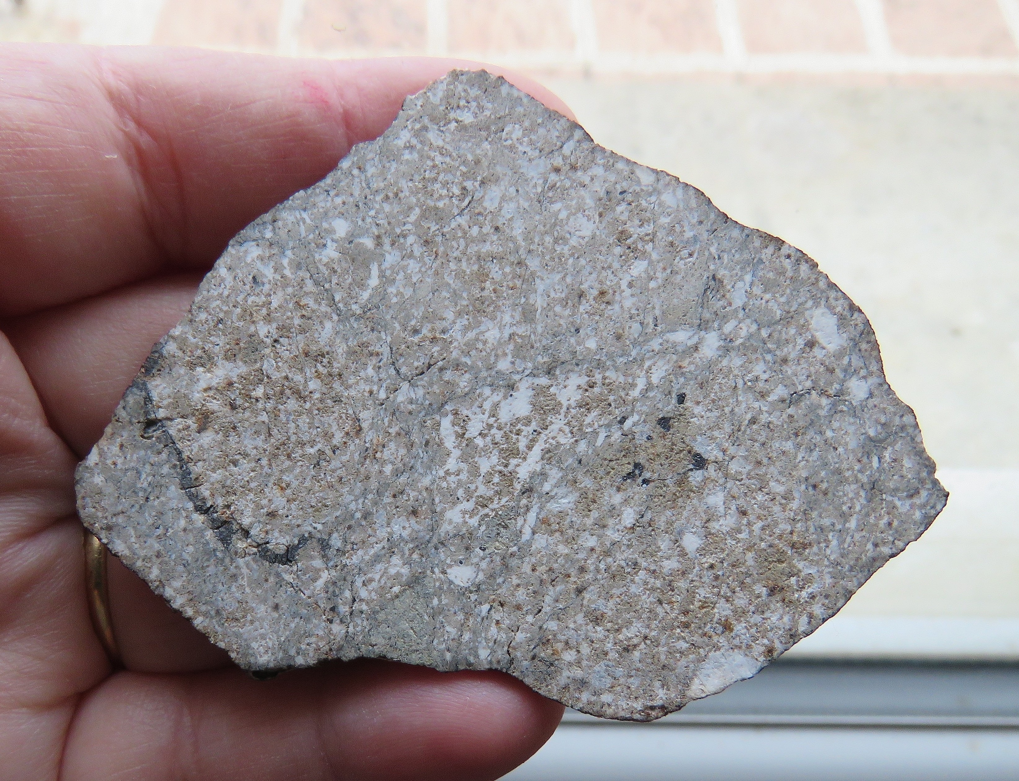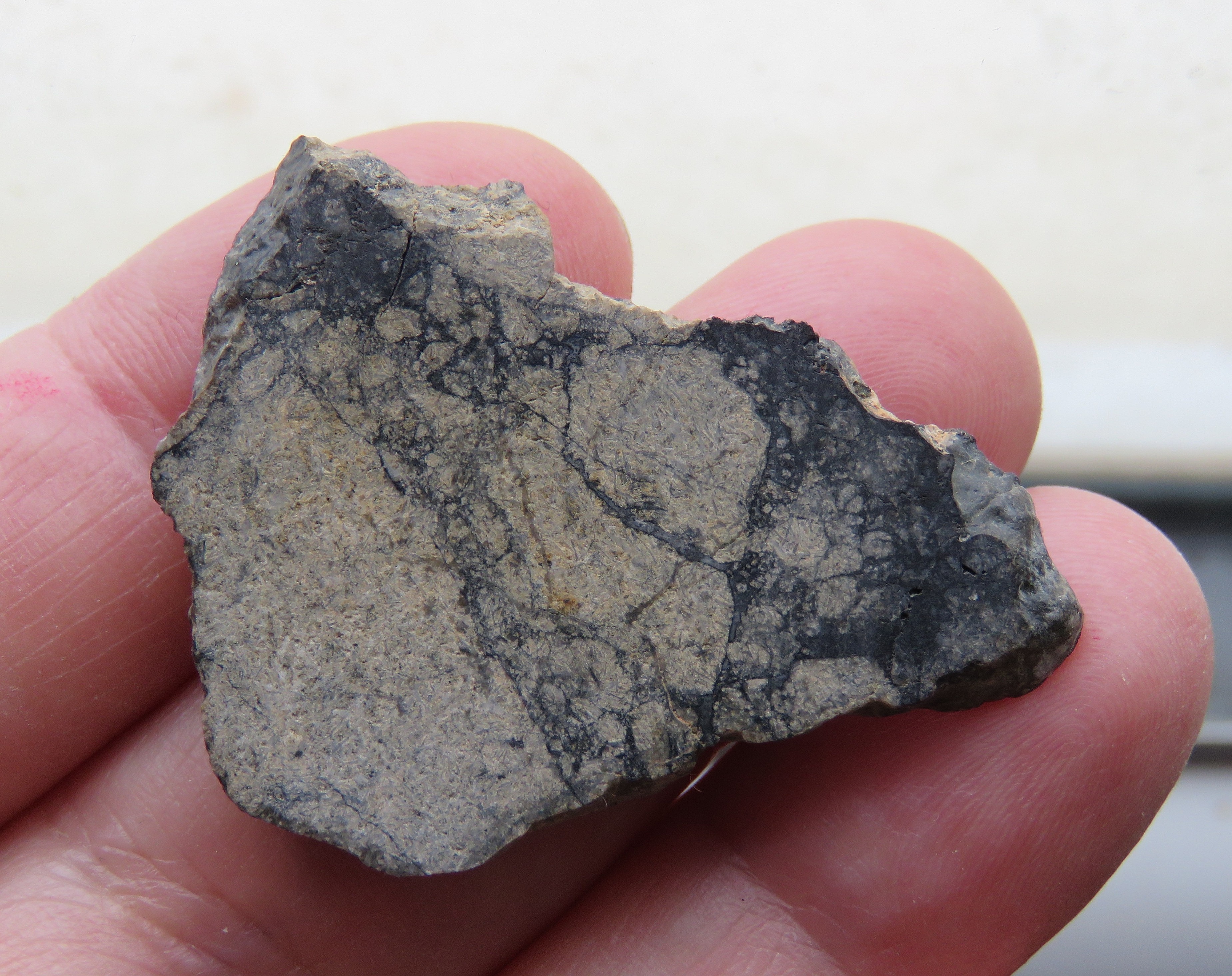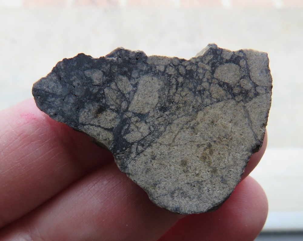 Une lithologie intéressante et peu commune: "grand" claste sombre de type CM2 (Cf Murchison) à l'intérieur d'une CV3 autrement bien classique, NWA 2086: Sur la page dédiée du Meteoritical Bulletin, peu d'infos précises comme souvent en ces années-là (2003) sinon qu'elle est peu altérée (W1) et peu choquée (S1)