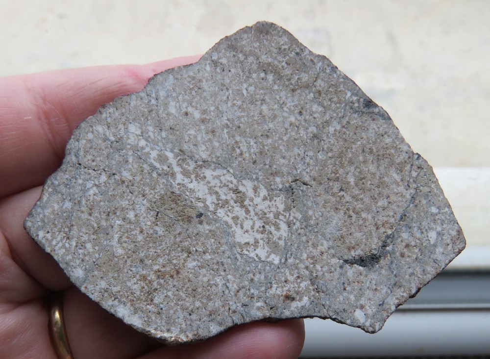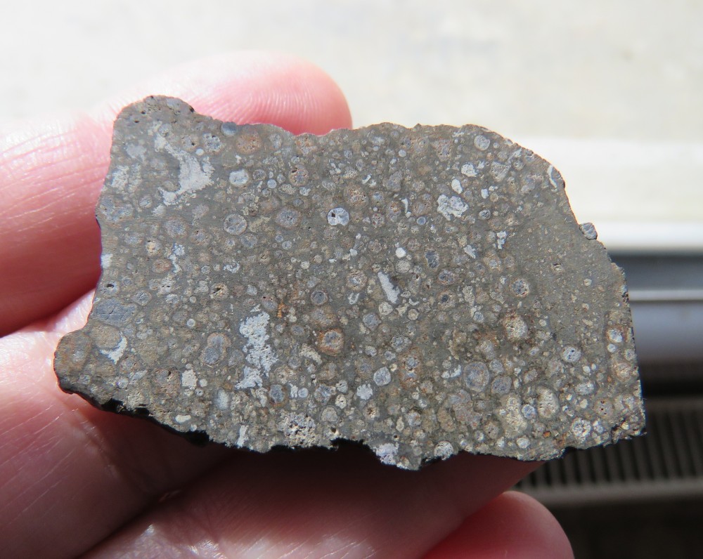 J'ai essayé de tirer le portrait de mes 2 howardites, pas évident compte-tenu du manque de lumière naturelle. Comme dit plus haut, la première, NWA 13370 est constituée à 70% de matériel eucritique et 30% de matériel diogénitique. Tranche de 2.69g, 33 mm de plus grande dimension. https://www.lpi.usra.edu/meteor/metbull.cfm?code=72487 Les petits grains d'orthopyroxène sont bien verts et gemmes. Elle montre également des clastes de carbonée et de matériel eucritique totalement fondu (clastes sombres). Elle est peu choquée. La seconde est NWA 17328, tranche de 8g, 44 mm de plus grande dimension. Elle est bien plus sombre que la précédente, plus choquée aussi. https://www.lpi.usra.edu/meteor/metbull.php?code=84940 A l'oeil nu, sans éclairage particulier elle parait gris très foncé, mais à la bino et en photo elle montre une dominante de vert sombre, et une lithologie complexe: 50% diogénitique, 25% eucrite cumulée, 25% eucrite basaltique, avec un cortège de minéraux accessoires: chromite, ilménite, silice et grains de ferro- nickel. -