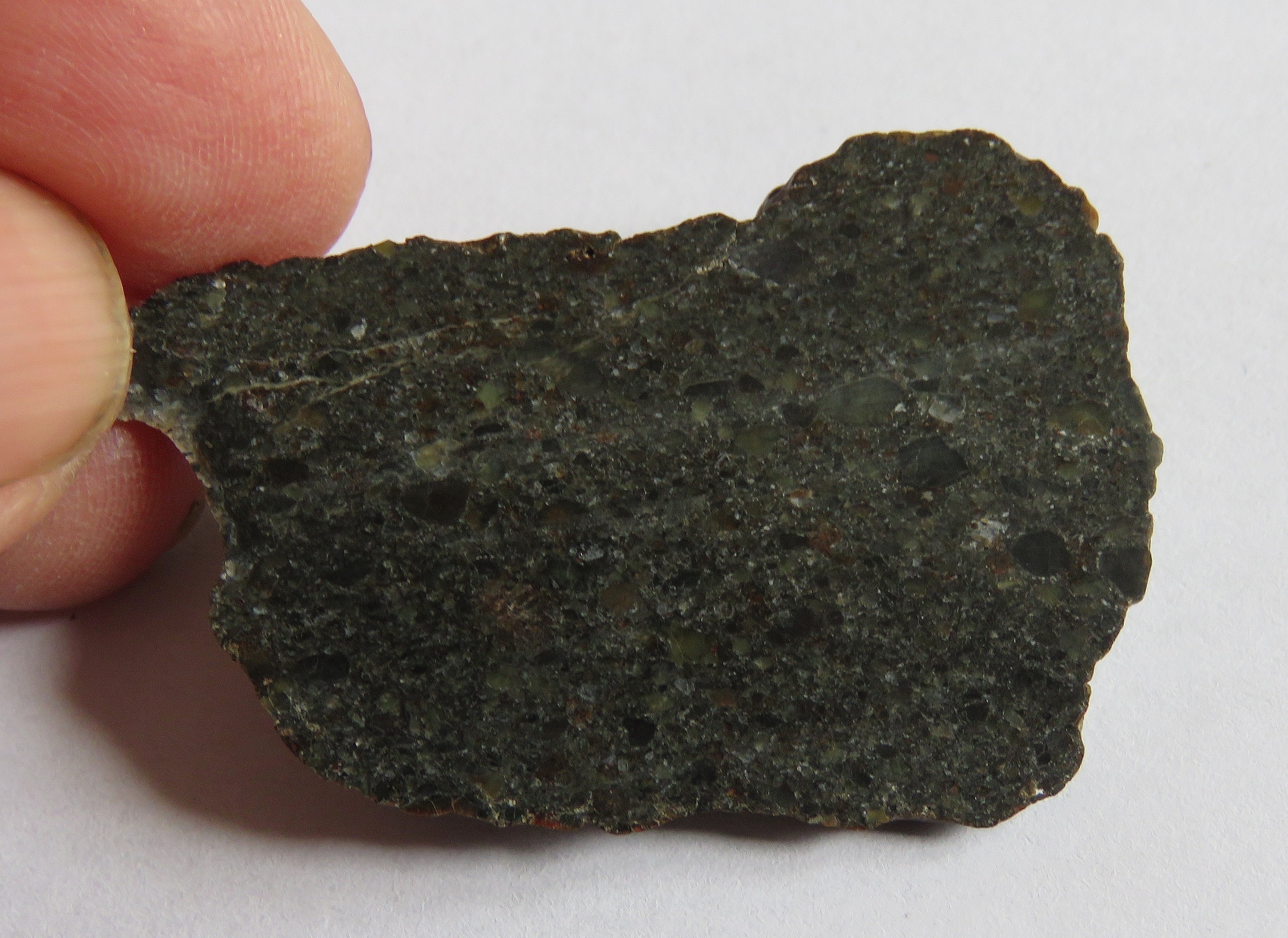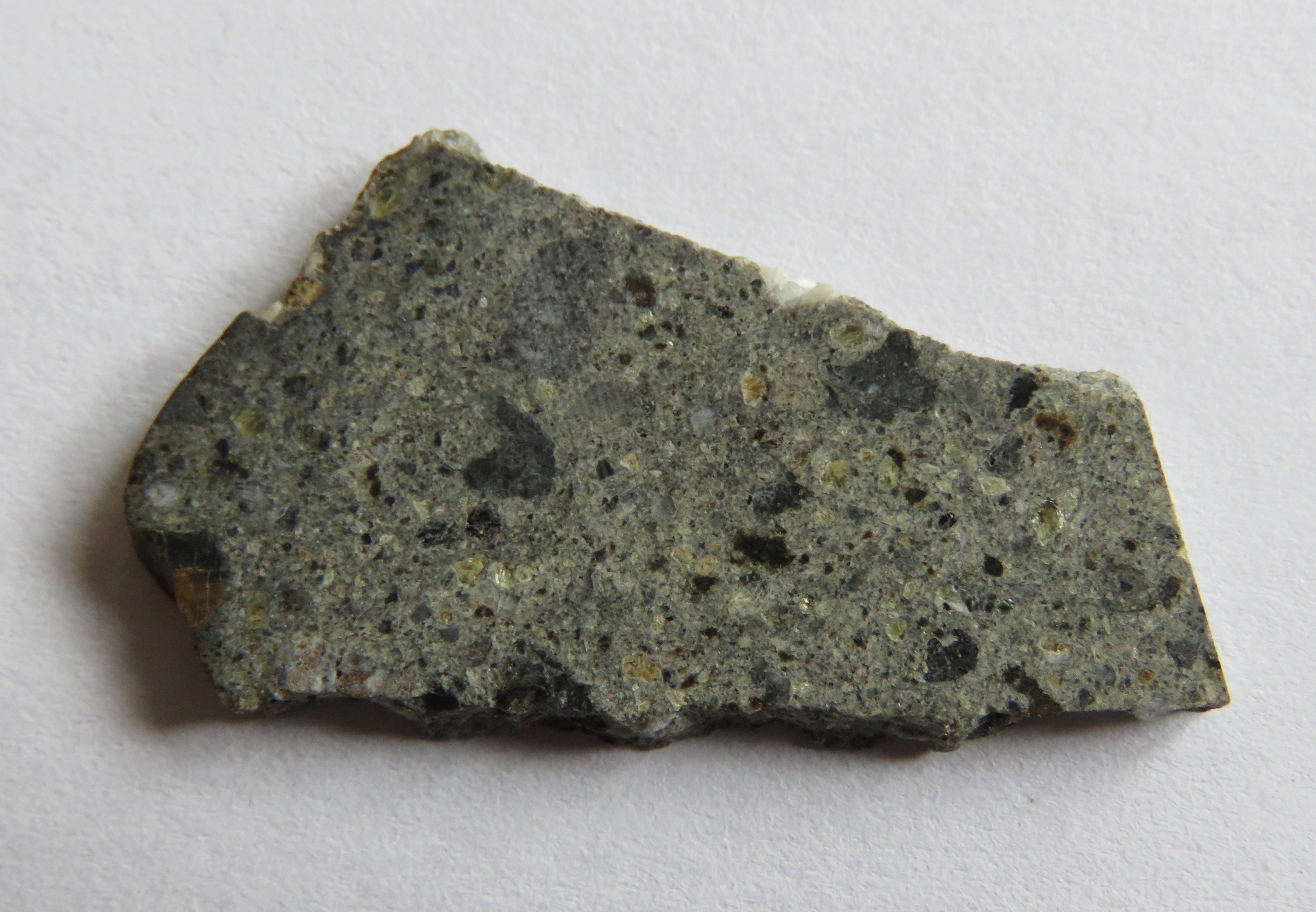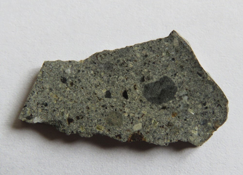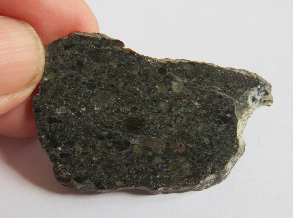 J'ai essayé de tirer le portrait de mes 2 howardites, pas évident compte-tenu du manque de lumière naturelle. Comme dit plus haut, la première, NWA 13370 est constituée à 70% de matériel eucritique et 30% de matériel diogénitique. Tranche de 2.69g, 33 mm de plus grande dimension. https://www.lpi.usra.edu/meteor/metbull.cfm?code=72487 Les petits grains d'orthopyroxène sont bien verts et gemmes. Elle montre également des clastes de carbonée et de matériel eucritique totalement fondu (clastes sombres). Elle est peu choquée. La seconde est NWA 17328, tranche de 8g, 44 mm de plus grande dimension. Elle est bien plus sombre que la précédente, plus choquée aussi. https://www.lpi.usra.edu/meteor/metbull.php?code=84940 A l'oeil nu, sans éclairage particulier elle parait gris très foncé, mais à la bino et en photo elle montre une dominante de vert sombre, et une lithologie complexe: 50% diogénitique, 25% eucrite cumulée, 25% eucrite basaltique, avec un cortège de minéraux accessoires: chromite, ilménite, silice et grains de ferro- nickel. -