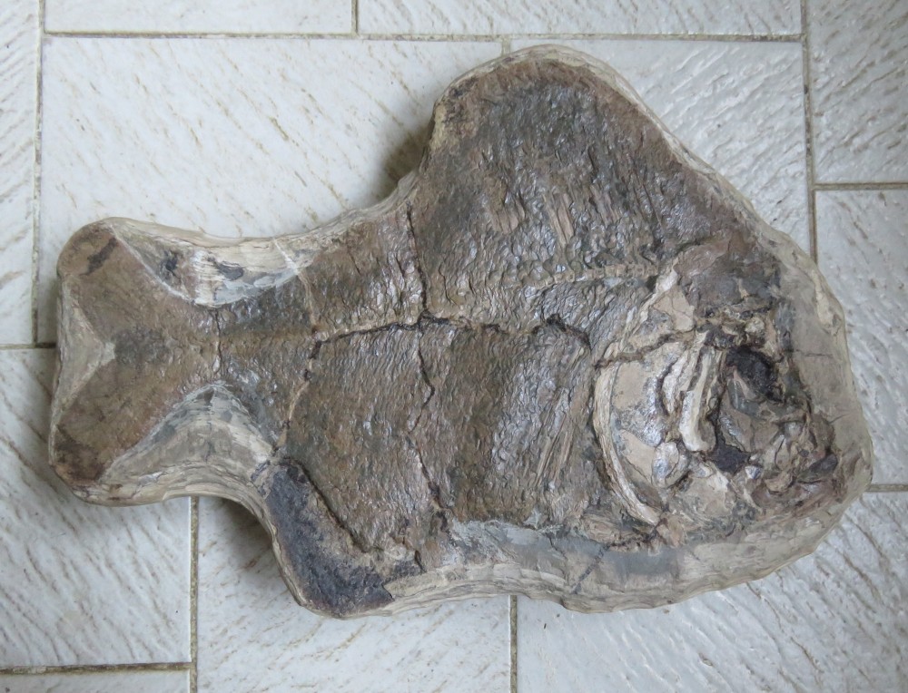 7. Un grand Araripichthys castilhoi de la formation Santana (Aptien-Albien), Chapada do Araripe, Cearà, Brésil (32 cm de longueur). Un étrange poisson discoïde, rare dans la formation Santana, qui donne du fil à retordre pour trouver sa place dans la phylogenèse des poissons osseux. Il est édenté, couvert de très fines écailles, y compris sur ses nageoires dorsale, anale et caudale. Edit: sorry, il n'est pas français !