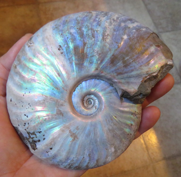 4. Oui, c'est naturel : les ammonites possédaient toutes, à l'origine, une coquille nacrée. C'est leur aspect naturel, qui est maintenant différent selon les gisements, et la qualité de conservation quand on les trouve à l'état brut. La conservation diffère fortement selon le milieu où la coquille a été préservée pendant des dizaines de millions d'années. Voici une Cleoniceras de l'Albien de Madagascar non polie: les irisations de la nacre originelle sont conservées Et une Kranaosphinctes rabei de l'Oxfordien de Madagascar, non polie: la nacre est naturellement altérée, blanchie, même si des irisations peuvent parfois encore apparaitre sur le spécimen quand on le trempe dans de l'eau. Ces deux fossiles n'ont subi aucun traitement de surface après leur récolte. Le polissage tel que pratiqué sur les spécimens malgaches abrase et fait disparaitre les fins détails, qui existent toujours à la surface des coquilles à l'état brut. Cette Kranaospinctes, en particulier, montre l'aspect de l'ouverture naturelle de la coquille, avec son embouchure échancrée et ses apophyses jugales.