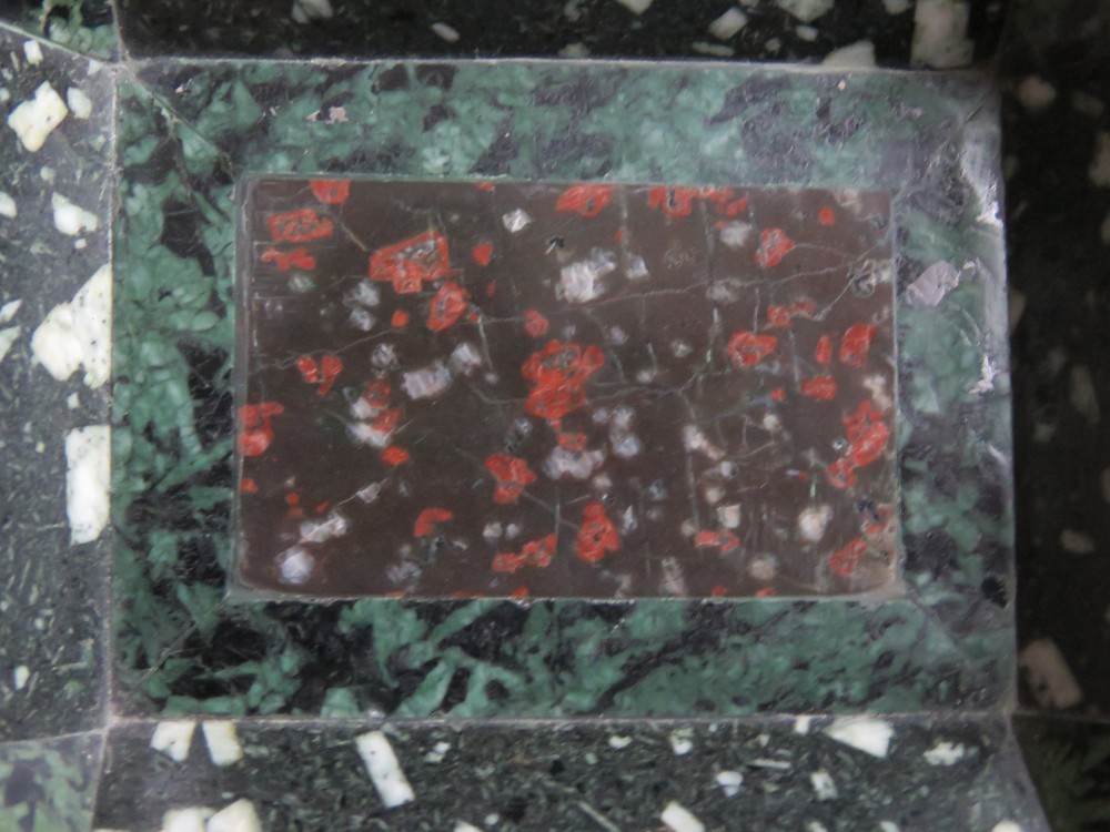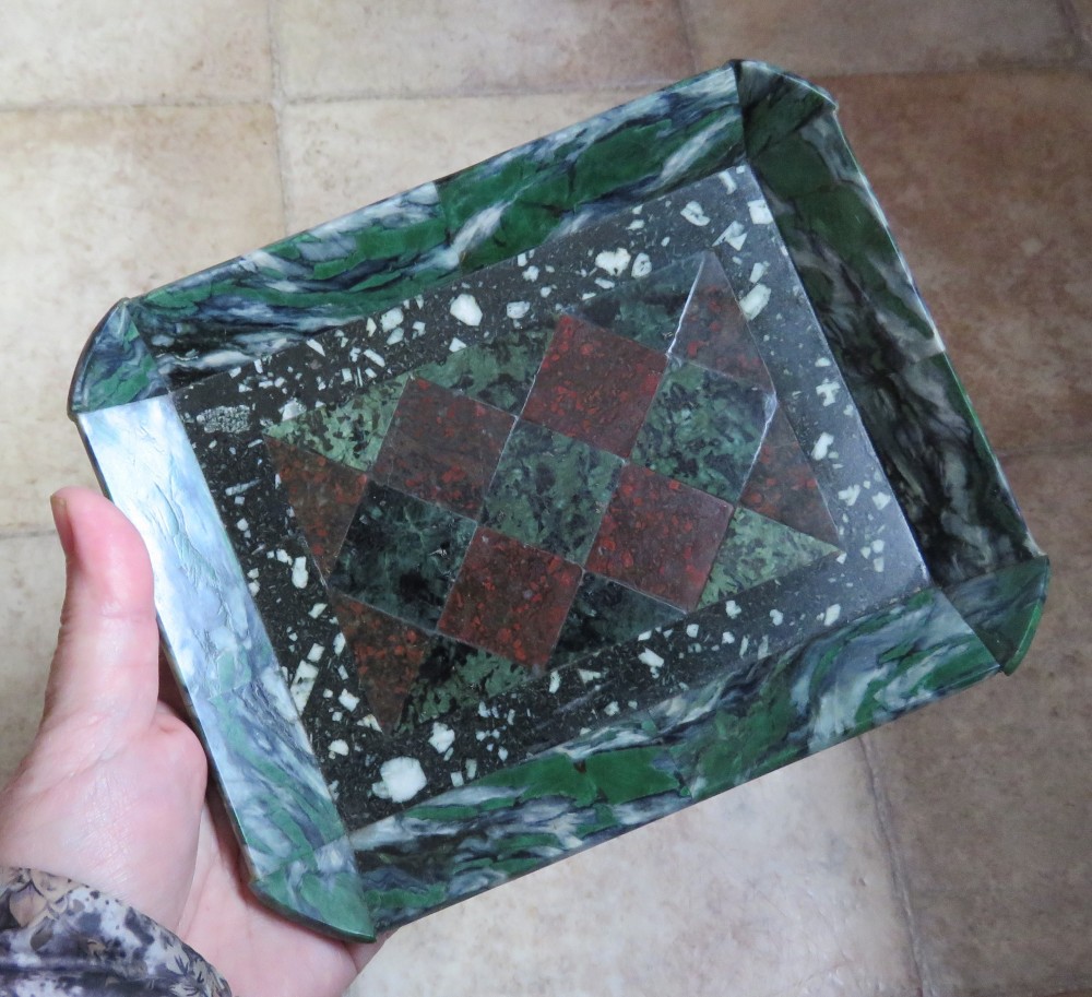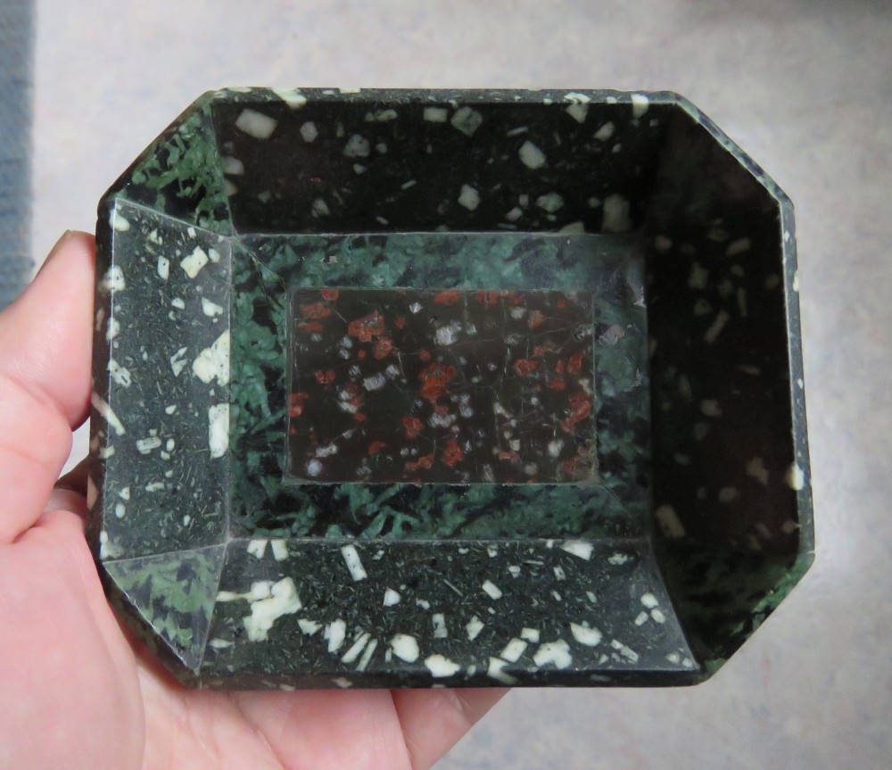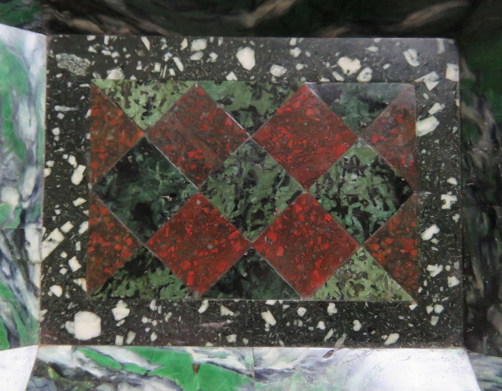 A titre de comparaison - et d'identification donc pour moi aussi ! - voici des images de la roche que j'ai trouvée à Radule, non loin d'une cascade, dans une zone relativement plate de la vallée. J'étais restée sur une identification en tant que "porphyre vert antique". Un filon d'environ un mètre de large et une dizaine de mètres de long y était visible à l'affleurement, sur le sol rocheux lui-même. Le filon paraissait plus sombre que l'encaissant. Malheureusement, pas de photos ! J'ai ramassé une seule volante, de quelques centaines de grammes, dans un ruisseau à proximité immédiate. La couleur du fond est un vert très foncé, presque noir. Je l'ai sciée pour l'utiliser dans plusieurs objets, dont cette boite, où elle est associée au gabbro à smaragdite d'Orezza.
