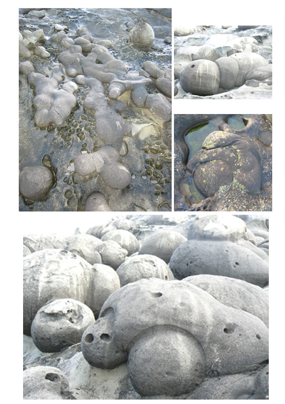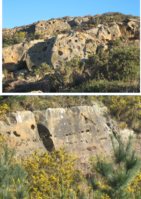 Au Jaizkibel (montagne à la frontière espagnole en face de Hendaye . eocene ) on trouve bcp de rochers « gruyère ». Du grès qui semble plein de bulles !. Parfois alignées de manière étonnante (comme le long d’une strate ?).Photo 1 En fait ces trous sont dus à l’élimination de sphères elles mêmes en grès. On en retrouve qq unes grosses coincées sous les rochers. Photo 2 à suivre…