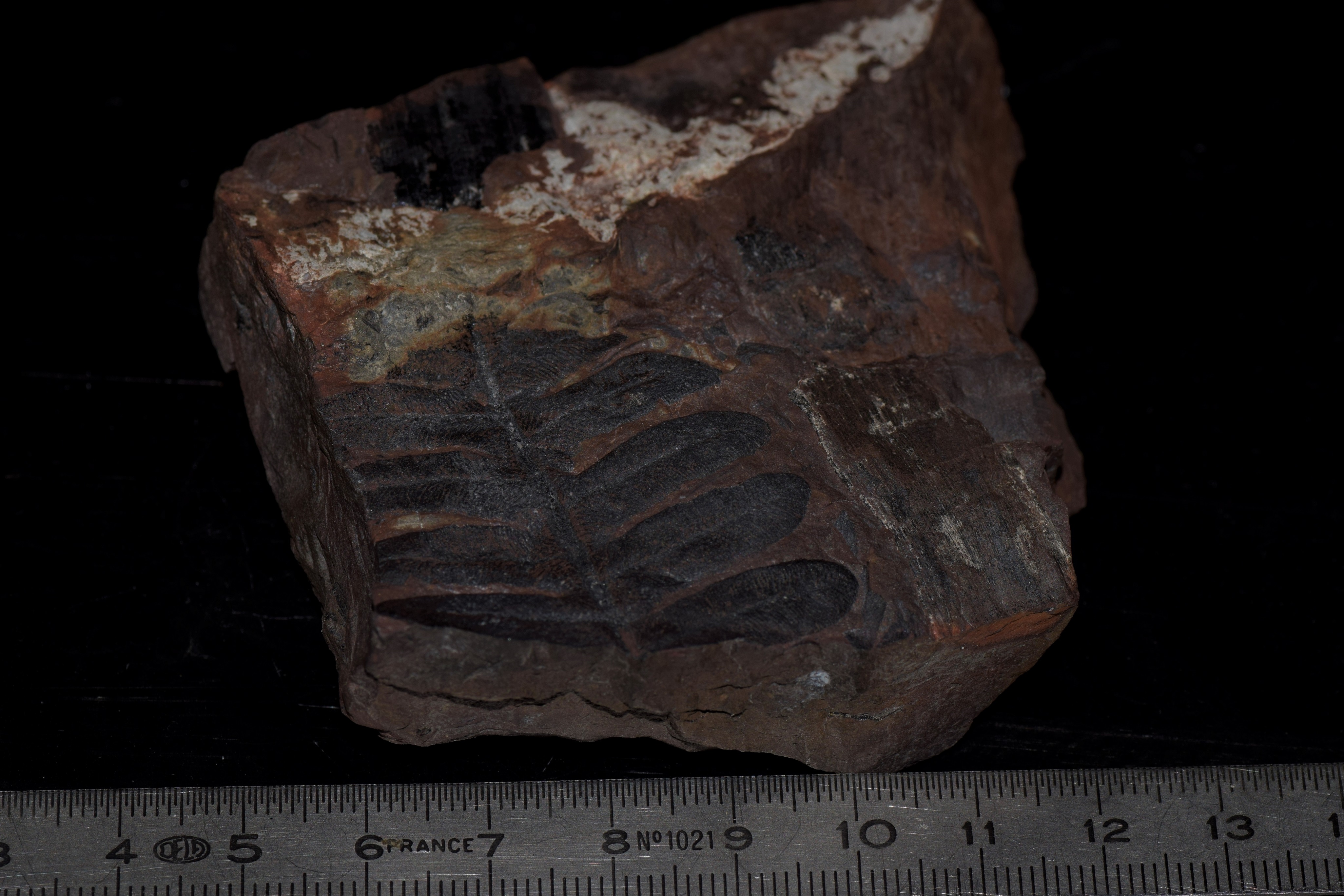 calamite (4cm X 14 cm) pécoptéris (sur un support contenant du fer ??? partie orangée comme "rouillée) Quelques fougères effacées sur celle ci mais c'est la partie blanche brillante qui m'a attiré l'œil... qu'est ce ? un dépôt de quartz ? fluorine ? -
