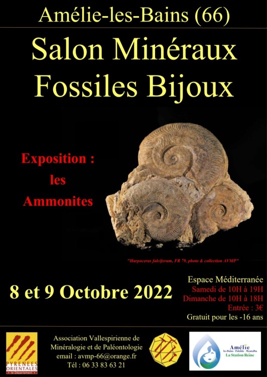 Bonjour à toutes et tous, Vous pourrez nous y retrouver par mis les bénévoles de l'organisation. 11ème Salon de Minéralogie d’Amélie-les-Bains Le Salon de minéralogie vous permettra de découvrir la beauté du règne minéral grâce aux 17 exposants qui proposeront à la vente des minéraux bruts, des fossiles et des bijoux. C’est la fluorite qui sera le minéral-phare de cette année avec trois vitrines d’exposition qui lui seront dédiées. Les pièces exposées ne sont généralement pas visibles pour le public car elles seront exceptionnellement prêtées par les membres de l’Association Vallespirienne de Minéralogie et Paléontologie. La fluorite présente de beaux cristaux généralement cubiques de presque toutes les couleurs possibles, violet, bleu, vert, jaune, rose, incolore, transparents ou translucides. Les collectionneurs les apprécient particulièrement. Cette exposition sera accompagnée par des panneaux explicatifs sur la fluorite et sur les deux grandes exploitations du département : Escaro et Le Boulou-Maureillas. Une conférence sur la Fluorite complètera le Salon, à 15h le dimanche 10 octobre à la salle de cinéma. Qu’est-ce que la fluorite ? Pourquoi cristallise-t elle en cube ? Comment se forme-t elle ? Quelles sont ses utilisations par l’homme, ses propriétés ? Espace Méditerranée, près de la piscine municipale Le Salon est ouvert samedi 9 octobre de 10h à 19h dimanche 10 octobre de 10h à 18h Entrée : 3€ ; gratuit pour les enfants de moins de 16 ans Pass sanitaire et masque nécessaires Petite restauration possible sur place Merci et à très bientôt