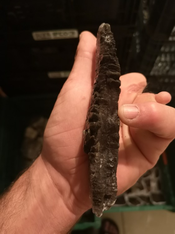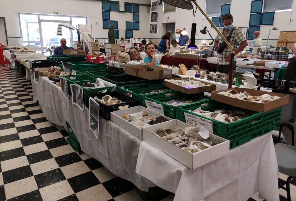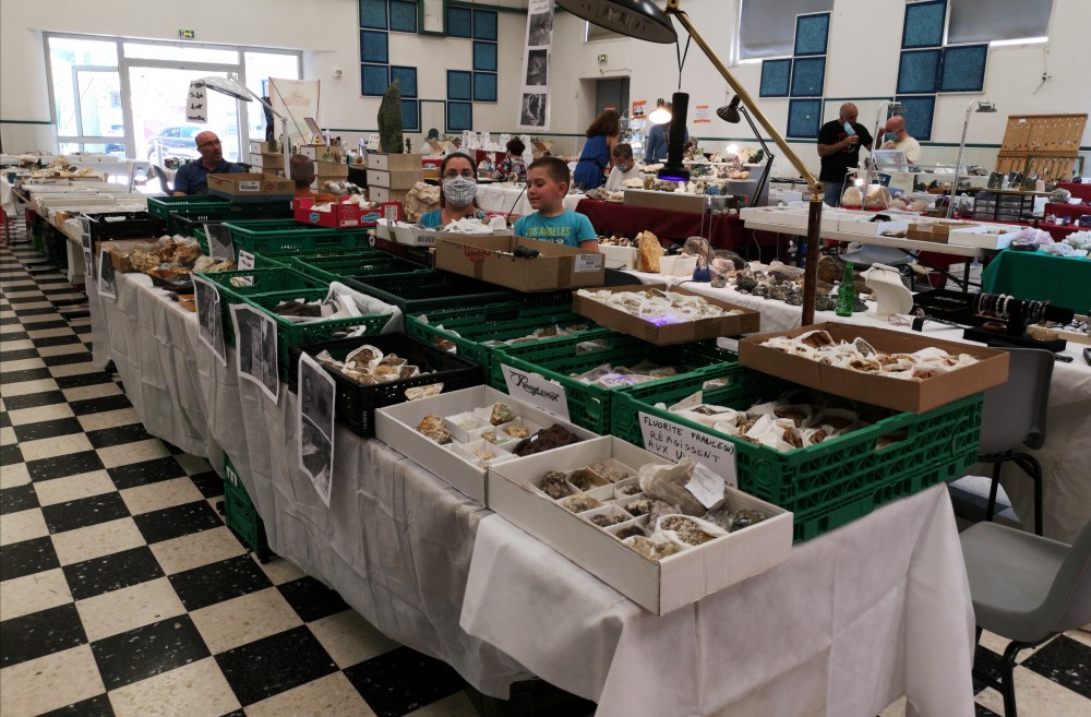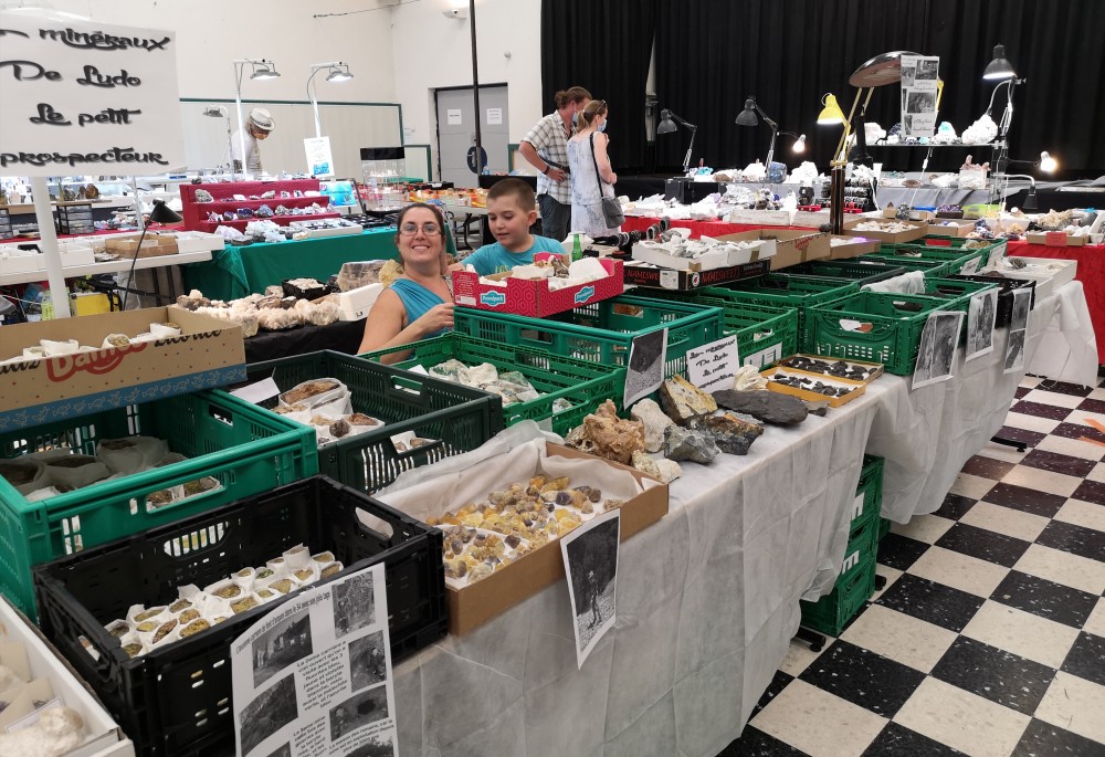 Merci @SACHA16, à mon avis c'est une dent de megalodon nain, mais alors vraiment nain ptdr. Oui le site est sympa et les trouvailles assez facile. On y retournera sûrement essayer de trouver un ou 2 autres chicots de requin. Après pour l'identification de la dent et des os le soucis c'est que n'y connaissant rien on ne connaît ni la couche dans laquelle tel ou tel fossile trouvé appartient et j'entends déjà les puristes râler. Pour continuer nos grandes vacances on aura eu le plaisir de participer le samedi à la bourse d'échange de Clermont de l Hérault. Une petite bourse vraiment très sympa, avec de très belles rencontres, et des tête connues venues nous rendre visite. Parmis toutes ces rencontres une nous aura plus marqué, un grand monsieur qui parle fort et rit beaucoup prénommé André, une personne en or, simple et le cœur sur la main, Ludo aura été gâté encore mille merci à toi. Pour le reste quelques échanges et achats bien sympa, fluo de la barre, fluo de St peray, fluo du beix, et fluo rose de fontsante, calcite de lacaune, calcite d'anduze ... Ludo aura même trouvé une petite pyrite de batère, il a sauté dessus Voici quelques photos prises pendant l'installation du stand. -
