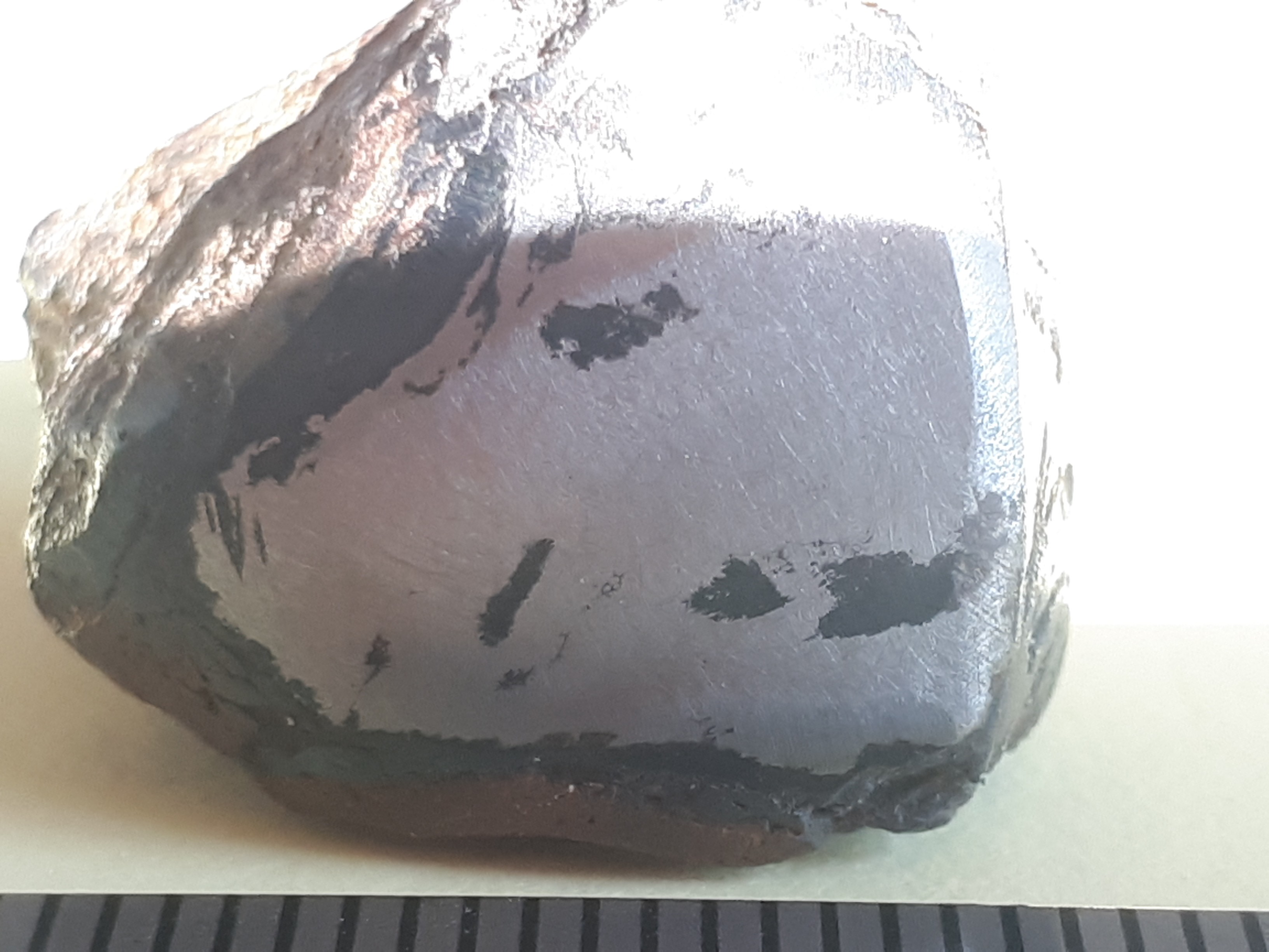 Il s'agit d'une roche magmatique, un gabbro (qui a été métamorphisé, soit pour être exact un "méta-gabbro"), qui est composé essentiellement de pyroxène et de feldspath ainsi que d'ilménite, apatite, et stilpnomelane (avec aussi de la pyrite et de la sphalérite associée). Certains gabbros extraterrestres existent, cependant ils sont différents! L'absence de minéraux choqués dans votre pierre confirme qu'il ne peut pas s'agir d'un "nouveau type de gabbro extraterrestre" car si c'était le cas il devrait contenir des évidences de choc...