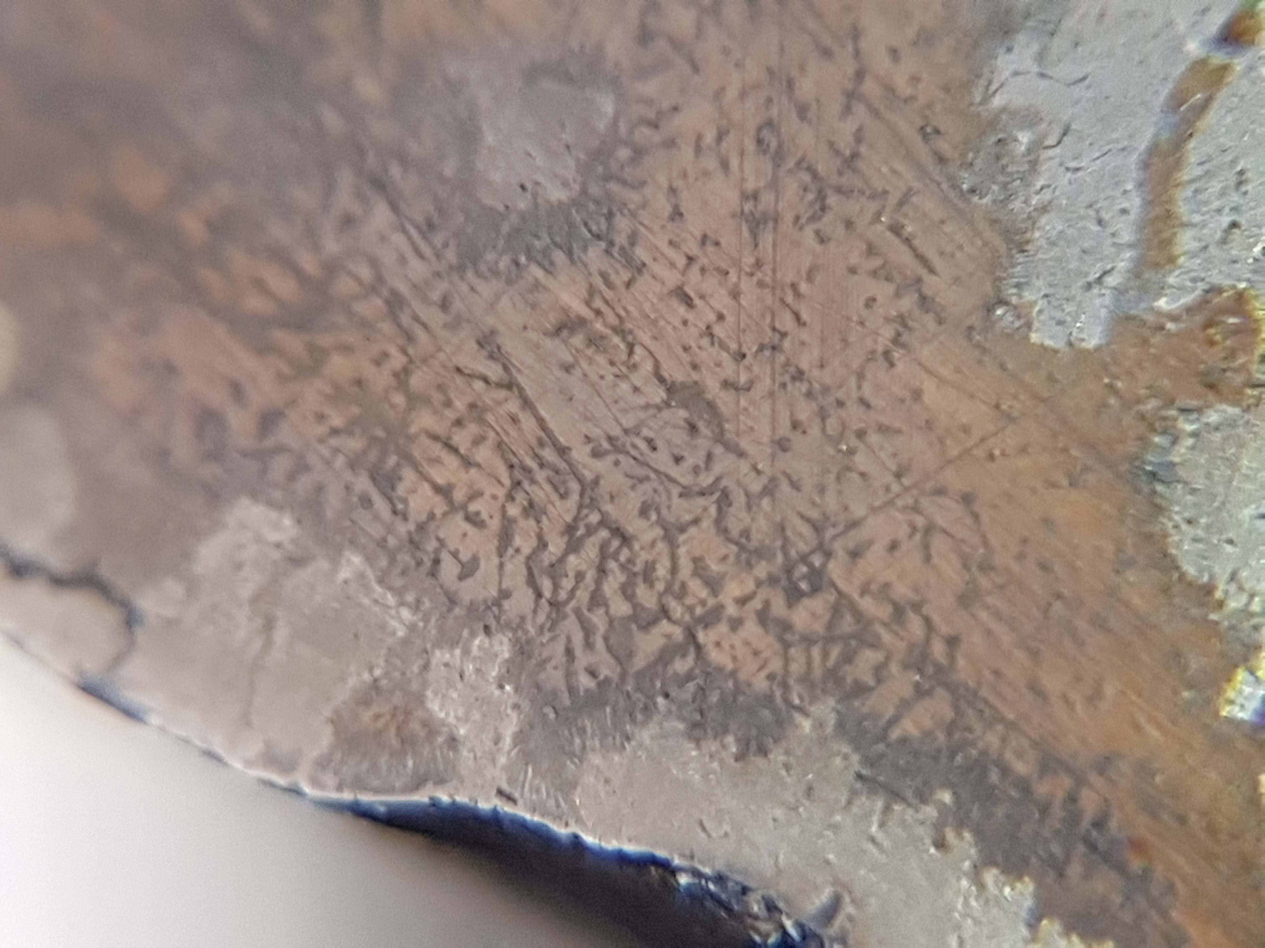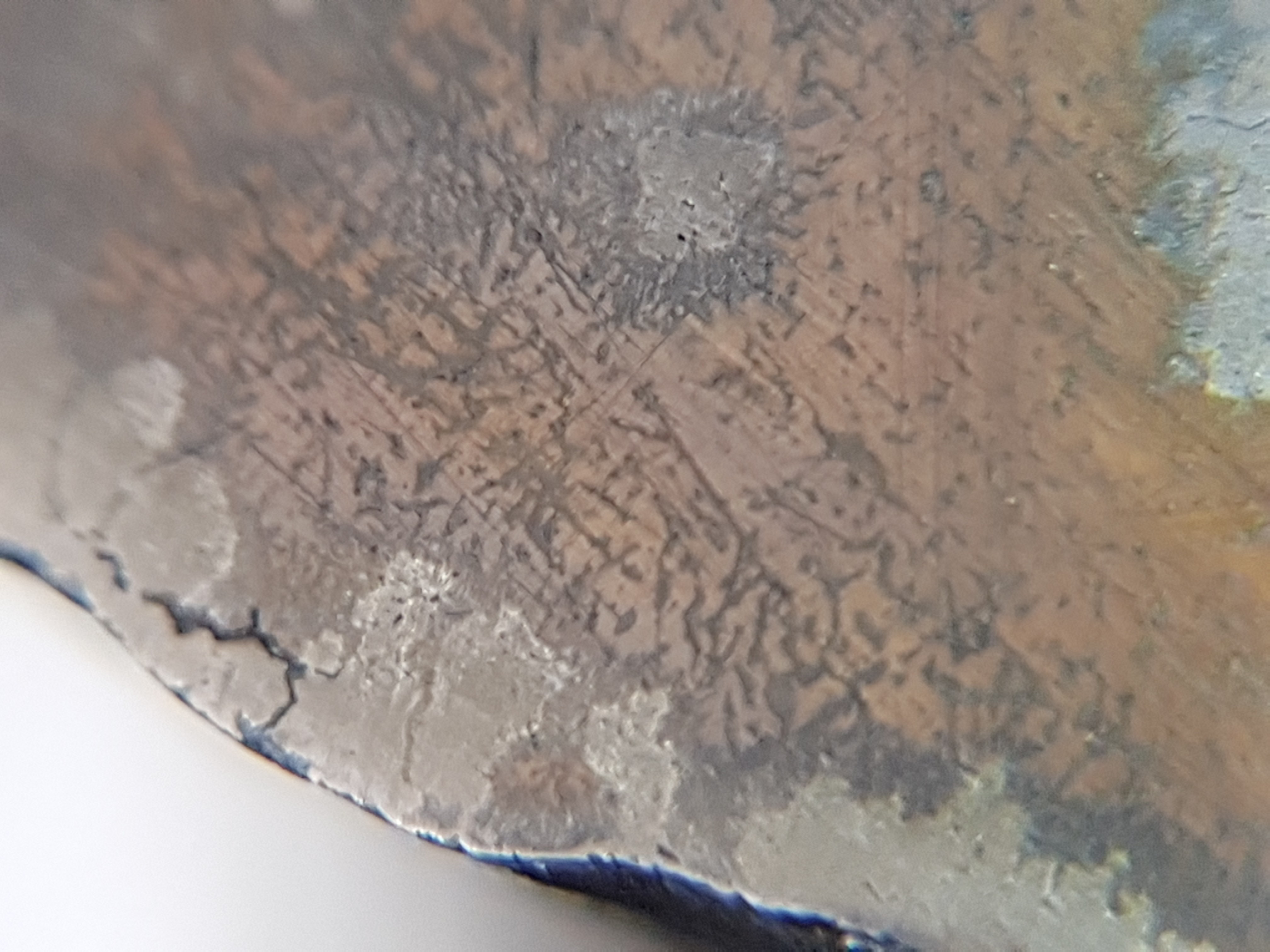 A ok...sinon juste pour savoir qu elle aurait dû être la réaction et la couleur du bain après la soude ? Penses-tu que ces lignes ( les fines) qui se croisent à 90° puissent être la texture ou la trame je sais pas comment le dire...de l acier ? Et dernièr question et je te laisse tranquille Dans un acier quel qu il soit carboné ou fargé par example , peut on y trouvé des aglomera de micro billes comme les chondres de ta Chondrite , je cherche un détail visuel qui distingue un banal metal d un extra terrestre si il y en a Merci à toi bonne soirée T as assuré a bientôt peut être