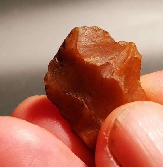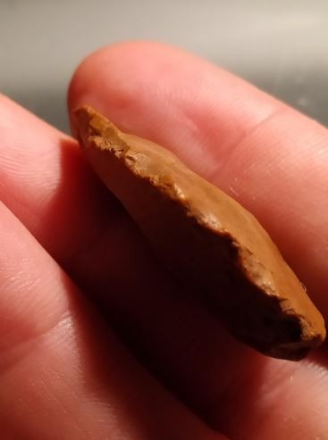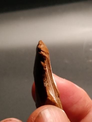 12. Bonjour, En cherchant de beaux cailloux avec mon fils l'été dernier en bas d'une cascade je suis tombé là-dessus. Est-ce taillé ? il fait 2 cm de long Merci d'avance