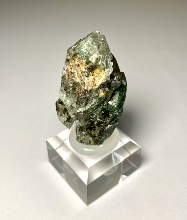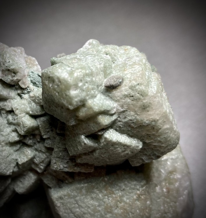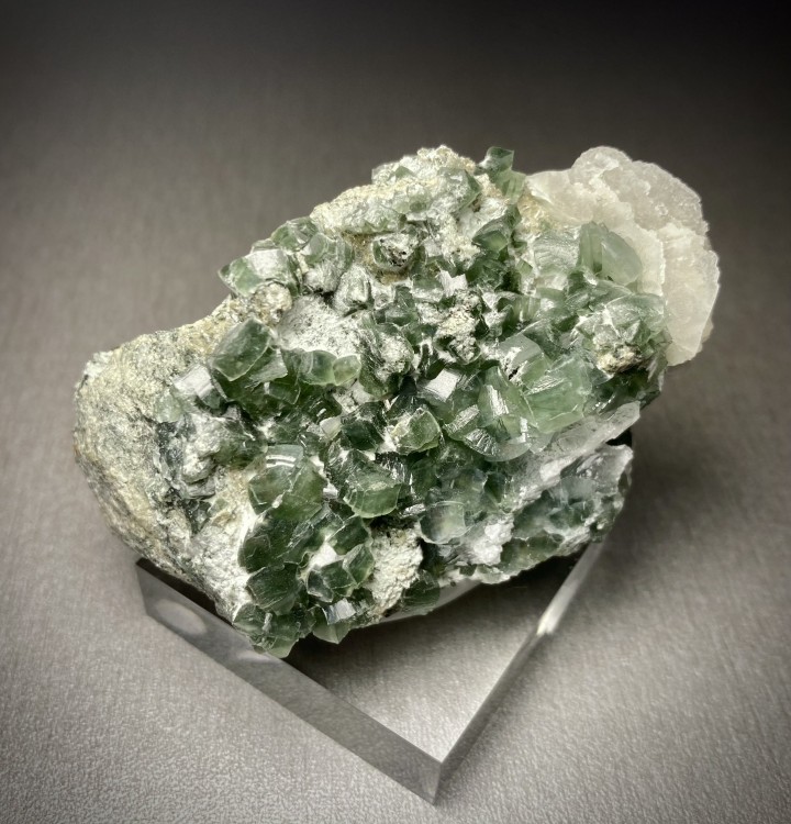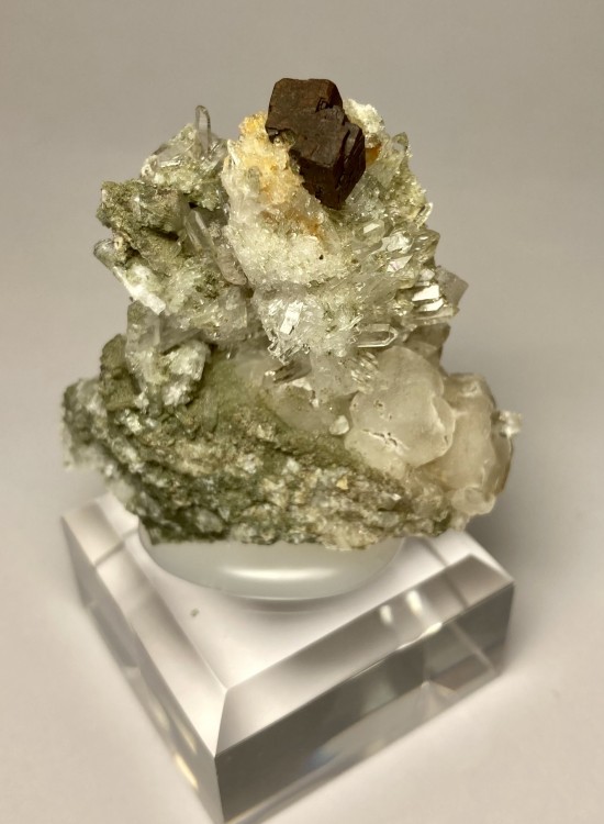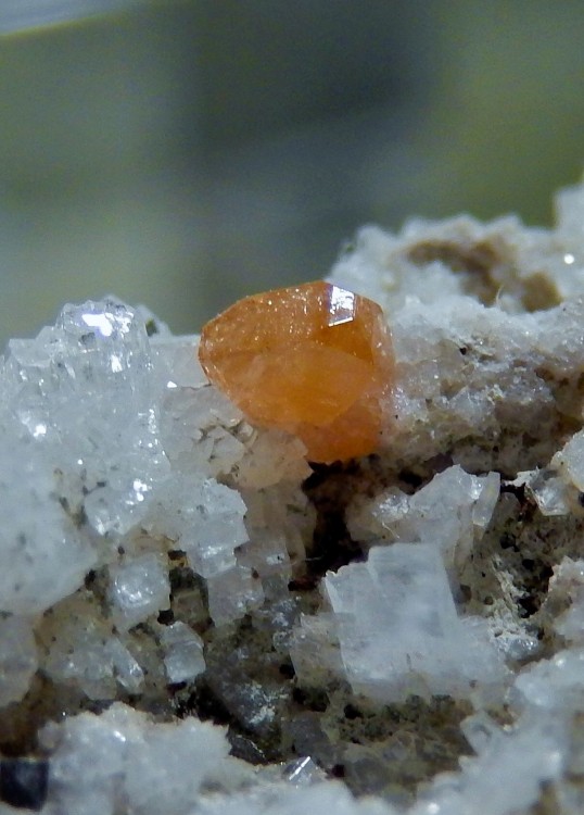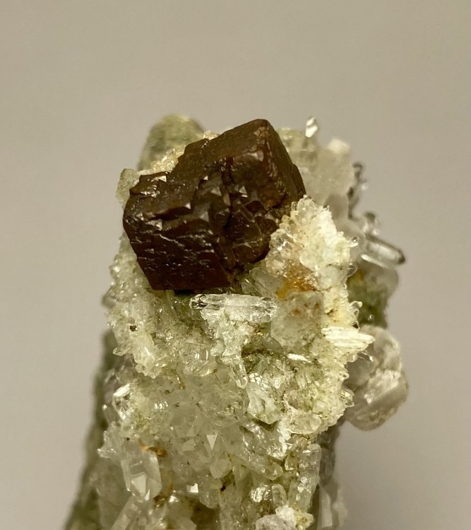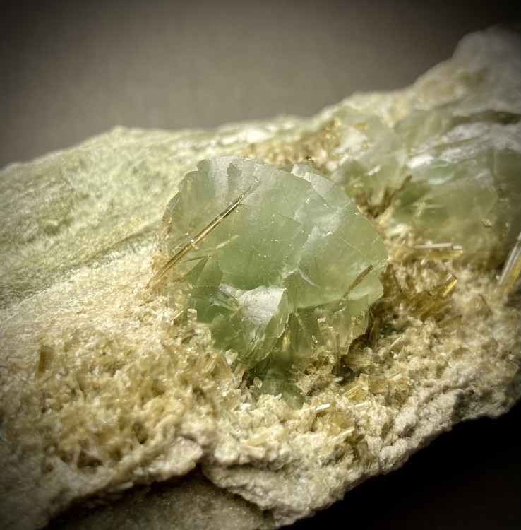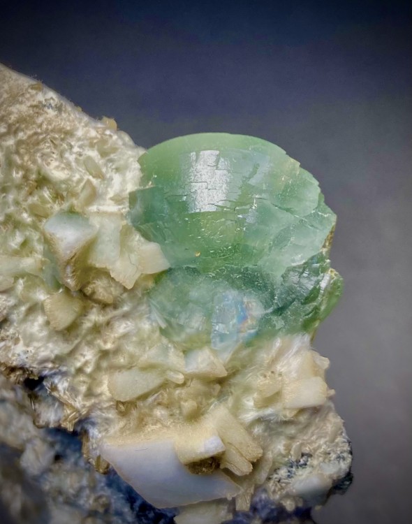 Petit clin d’œil à Astenis : petit casque de préhnite (2 cm) disposition aérienne sur gangue saupoudrée d’épidote et d’adulaire. Forestfly