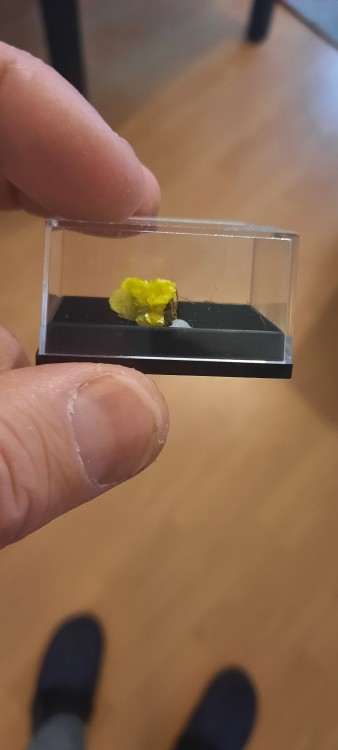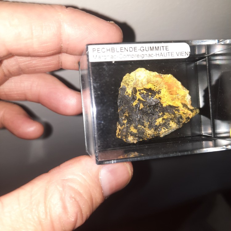 Bonjour, excusez moi mis je confondait avec ça . Je me suis mélangé les pinceaux ! L'étiquettage est important Une personne en voyant ce spécimen sans étiquetage (boîte retirée) a cru que c'était de l'hématite ou magnetite avec ocre en essayant de faire deviner. La boîte permet de contenir en partie le radon et les rayons alpha 🙂 et d'indiquer ce que c'est pour les autres...et pour moi-même aussi. Je me pose la question du risque quand une personne éteinte laisse une collection dont les enfants ignorent la nature de la pierre. J'ajouterai à terme un logo radiation. Le jaune est comme du yellow cake. -