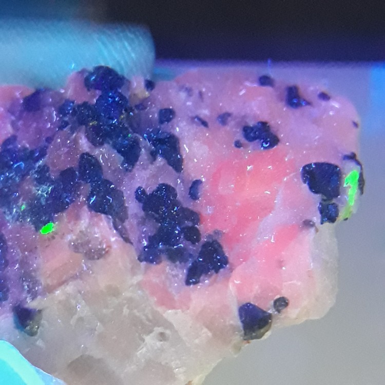Bonjour, J'ai une fluorine qui jaune avec calcite (je suppose...) sans aucune fluorescence. La fluorescence rose, est-elle plutôt caractéristique de la calcite ? (qui accompagnerait cette franklinite avec éventuellement Willémite) En vert, Willémite... En rose calcite? -