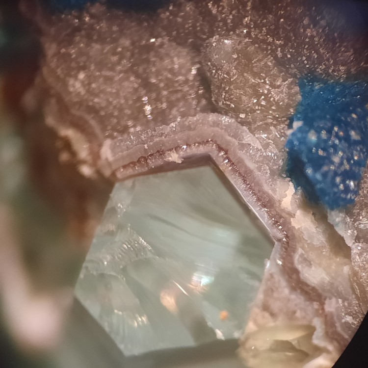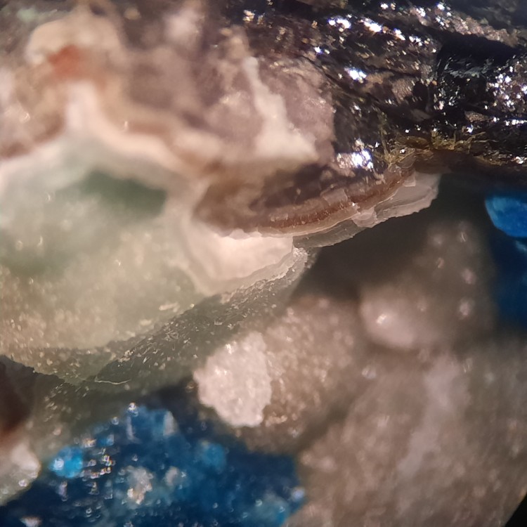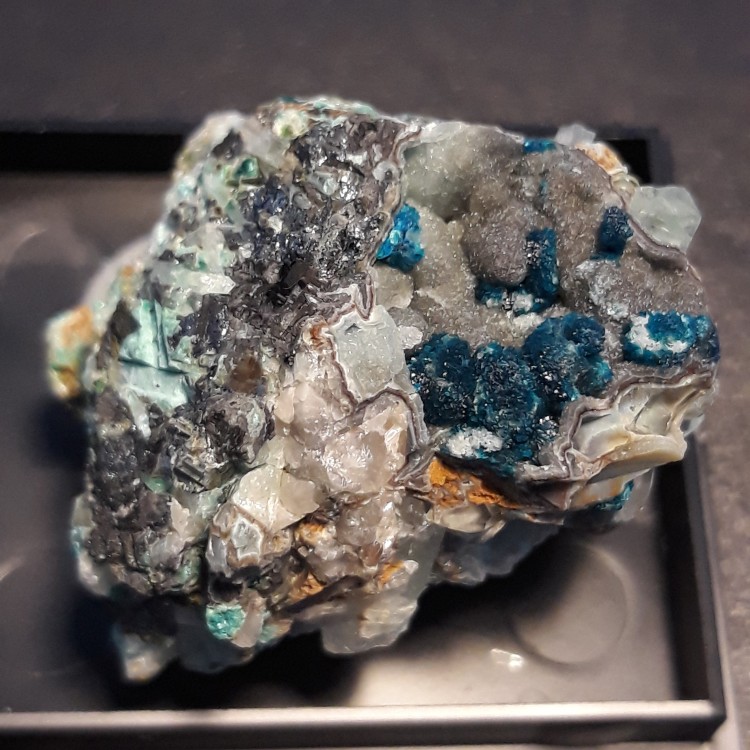 Bonjour, J'ai acheté une pierre provenant de la Loachang mine (Yunnan) en Chine. Je sais que la Veszelyite est bleue mais je me pose la question sur 3-4 autres minéraux présent sur cette pierre. Voici le spécimen en entier (figure 1). Je me pose des question sur le minéral tirant sur le kaki ressemblant à de la calcédoine qui accompagne ce minéral bleu (visible en figure 1, 2 et 5). En figure 3, il y a un cristal de forme hexagonal, je me pose la question sur un beryl...En figure 5 et 1, il y a aussi un minéral gris métallique dont je me pose des questions sur sa nature. Enfin, en figure 4, je ne sais pas ce que c'est ce minéral vert. Merci de votre éclairage 🙂 Figure 1 (ci-dessous) : Figure 2 (ci-dessous): Figure 3 (ci-dessous) : Figure 4 (ci-dessous) : Figure 5 (ci-dessous) : -