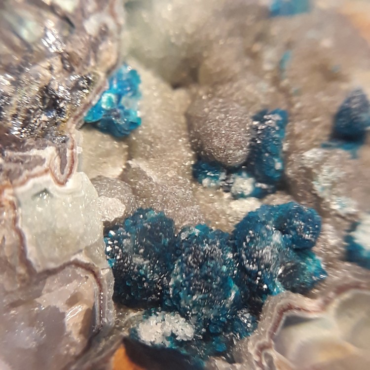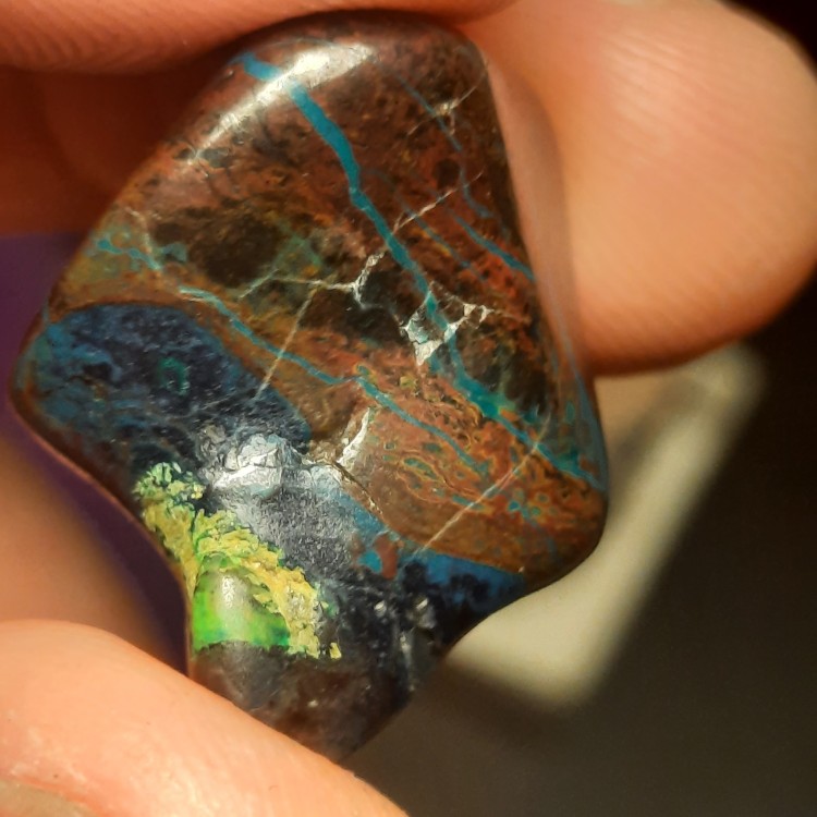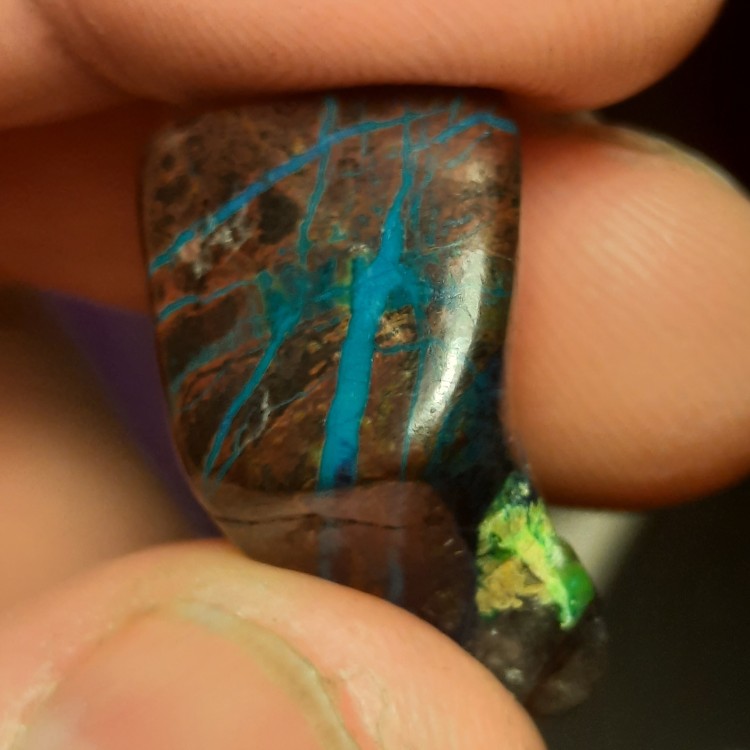 Le nom du minéral était un nom "barbare" car difficile à retenir. Je me souvient vaguement que c'était un minéral de cuivre à formule complexe. UV rien. Ce n'est ni de l'opale, ni de l'azurite, ni de la chrysocolle, ni même de la turquoise (pour les veines bleues). Je parle de cuivre car les minéraux bleus sont souvent à base de cuivre mais je savais qu'il y en avait surtout ! -