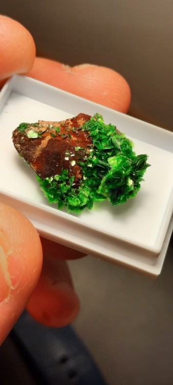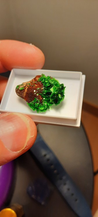 Bonjour, excellente année à vous, meilleurs vœux et bonne santé. Ci-dessous jolie malachite torbernite de la Haute-Vienne : @Benjtu as de bien beau échantillons mais attention à ta main qui va être irradié😁 -