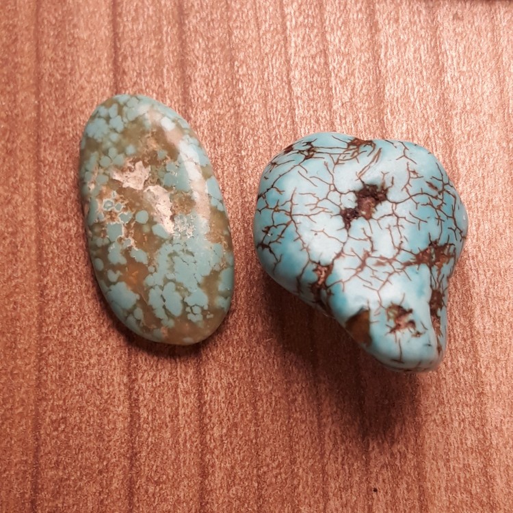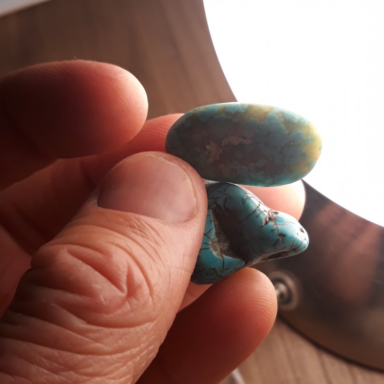 Merci pour ses précisions ! Effectivement el existe aussi de la turquoise pourpre mais bon la couleur n'est plus turquoise même si elle est jolie. Les plus belles et plus durs viennent d'Iran, celles-ci sont pas poreuses en plus et rarement traités contrairement aux turquoise américaines (chose évoquée par le gemmologue Patrick Voillot). Voici des turquoise à moi : Celle du haut est américaine et celle du bas du Tibet. La première est translucide à la lumière. Une autre photo plus nette.