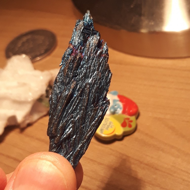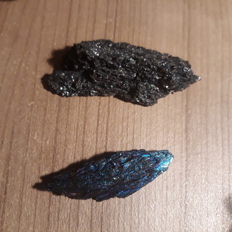 Test de dureté refait. Ca raye un verre mais pas le quartz. J'opterai pour du Titanium irisé... Comparaison avec du carborundum en haut qui raye bien plus facilement le verre et est bien plus fragile (ayant fait tombé les deux échantillons). -