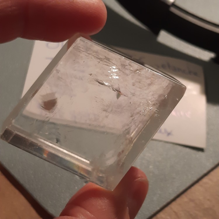 En tout cas ça ne raye pas ma pierre transparente qui dédouble l'image et ressemble à du verre (mais la cassure est différente du verre (cf. pointe sur la gauche de la photo). Pardon pour la digression. -