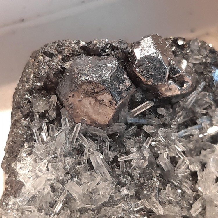 Bonsoir, J'ai des cristaux en provenance du Perou (Huaron) mais je n'ai pas le nom du minéral qui est associé à de petit cristaux de quartz. Le trait du minéral est noir. Avez-vous une idée? Cobaltine? Merci:) J'en profite également pour savoir quel minéral ocre en boule accompagne cette stibnite de Chine (cf. en infra)? Valentinite?