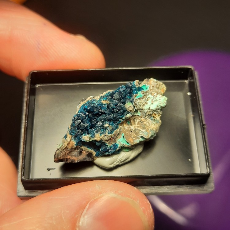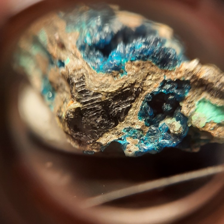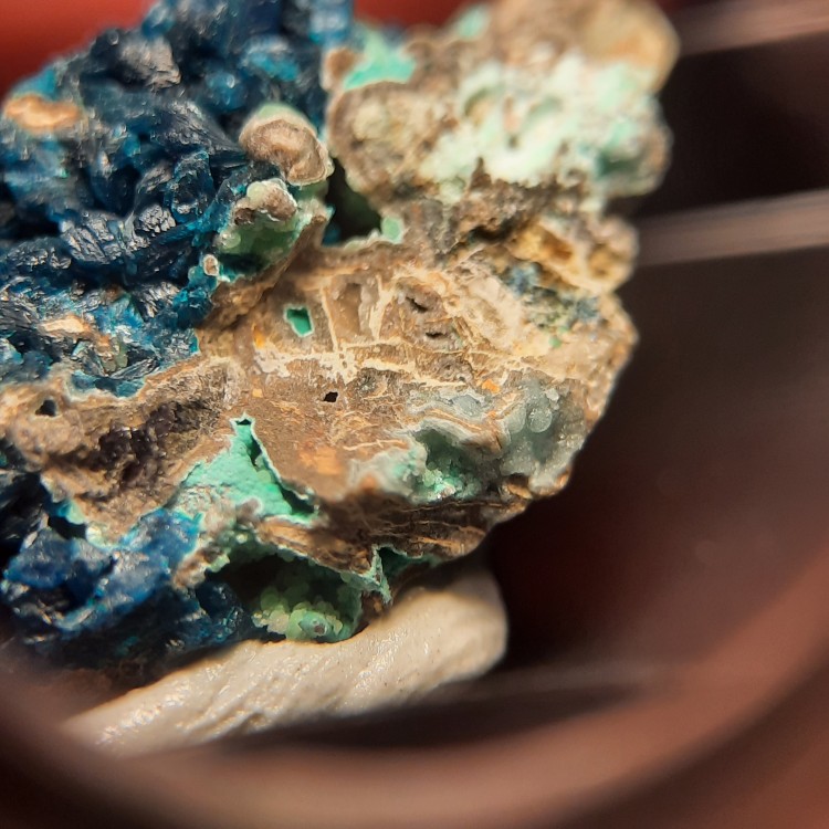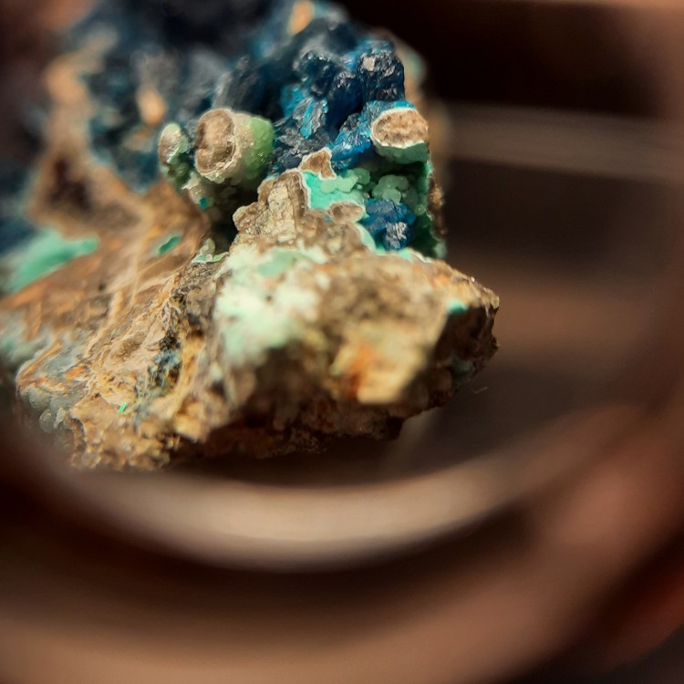 Bonjour je déterre ce topic pour vous montrer des photos d'une pierre provenant de chine et contenant au moins 3 minéraux rares dont un minéral agréé par l'IMA fin 2021 : la cuprodongchuanite (petit amas en boule verts pommes) qui accompagne la Veszelyite bleue. On ne risque ps de trouver ce type de minéral chez les lithoterapeutes. Places aux photos ! Attention : ce qui edt vertu turquoise est un autre minéral qui commence par t (pas turquoise) je crois mais je ne me rappele plus. Provenance : chine (Sanguozhuang-Dongchuan-Yunnan). -