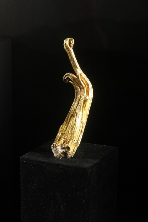 Bonjour Grenat66, Le panneau ne précisait pas la méthode de nettoyage, seulement qu'ils on retiré le quart et l'arsénopyrite. Généralement, le nettoyage est effectué en combinant l'effet du fluorhydrique et le mécanique (notamment pour la finition et éviter d'avoir cet effet de quartz fondu pas très joli). Cette pièce a pendant longtemps été présentée au muséum d'histoire naturelle de Los Angeles où elle était en prêt, sous la forme d'un morceau de minerai aurifère, jusqu'à ce que les héritiers, les ayant-droits demandent à Krystalle de dégager l'or contenu pour voir à quoi ça ressemblait ... Bonne initiative ! -