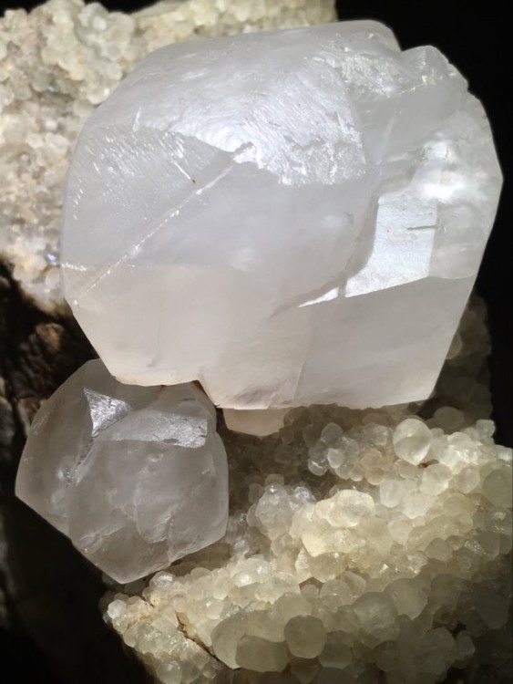 En voici deux exemples , aucun faciès particulier et plutôt rugeux d' aspect oeil nu Peut être n est ce pas le terme approprié mais je crois que si . Je joins avec ce qui me semble être une périmorophose de quartz cubique (??) ,toujours par cette même calcédoine Deux jolis exemples de calcites maclées sur gangue de Joncels , les petits cristaux eux aussi sont maclés . -