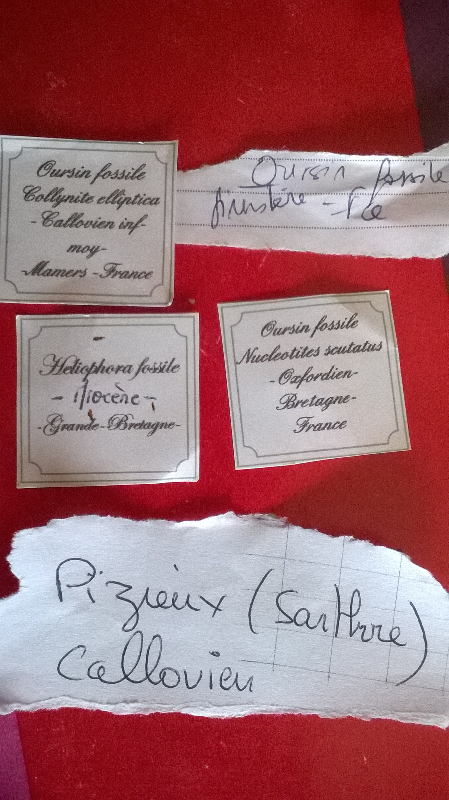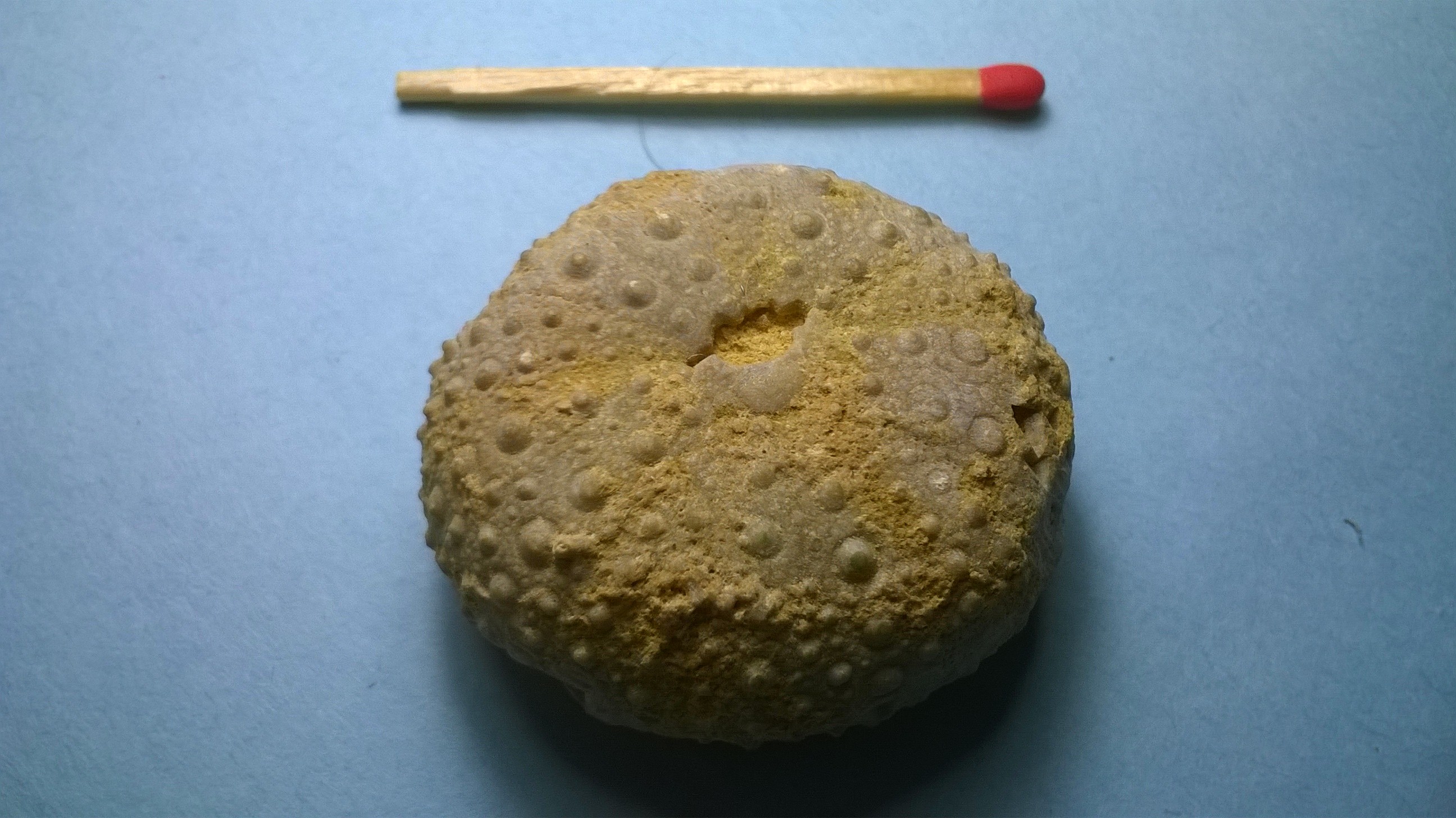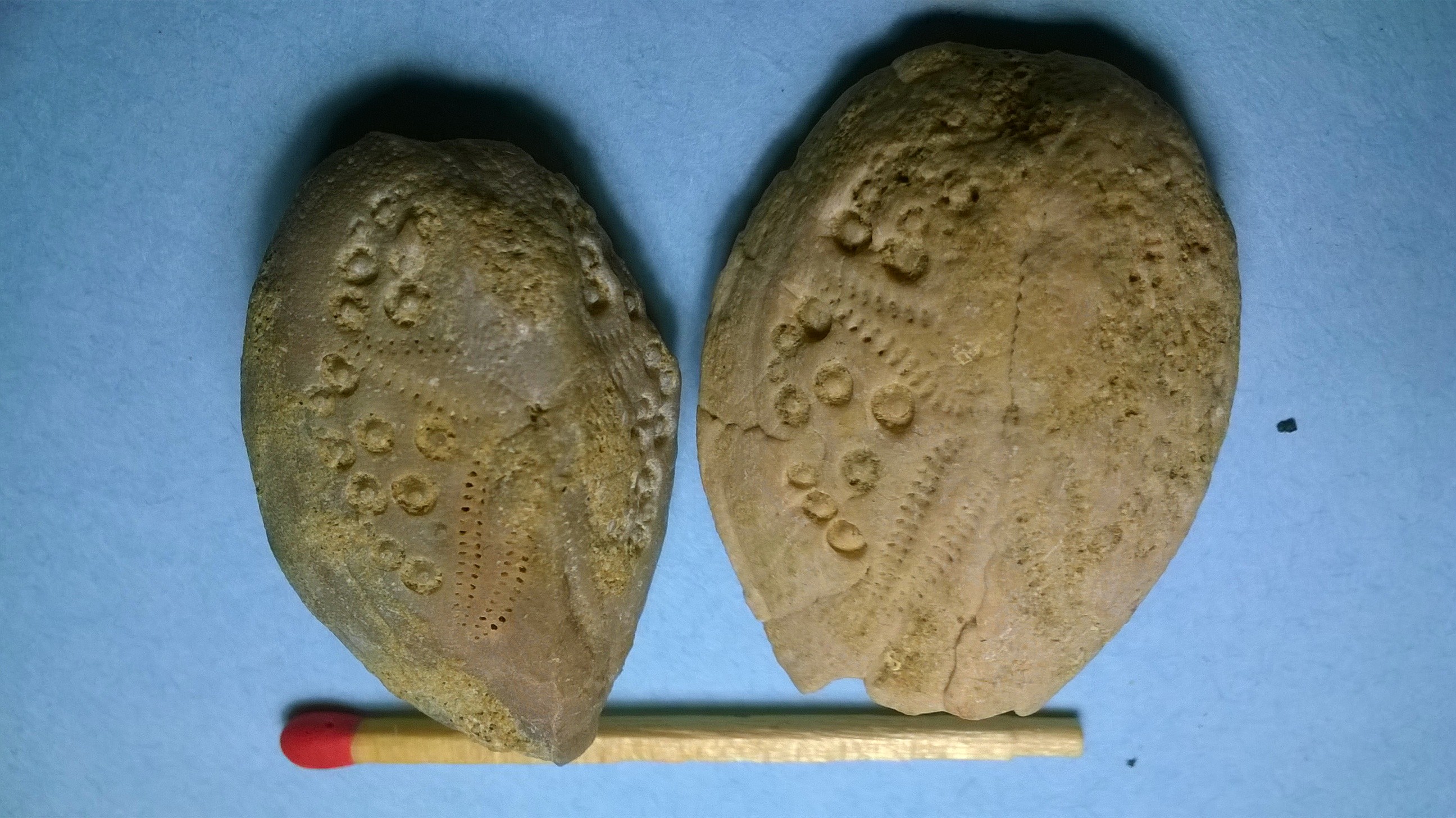 Je suis nouveau sur le forum. En fouillant mes fonds de tiroirs, j'ai fait un inventaire de mes oursins fossiles, malheureusement, pour la plupart, je n'ai plus d'historique, donc si certains peuvent m'aider à les identifier. Certains m'ont été données par mon oncle et sont originaires du Quiou (départ 22, ancienne mer des faluns, miocène je crois), d'autres ont été achetés un peu au hasard par ma femme qui collectionne les minéraux, et j'en ai trouvés quelques uns en Nouvelle-Calédonie là où je vis actuellement. Je suis conscient que sans les lieux de découvertes, ni les étages, juste avec des photos, l'identification est peut-être délicate, mais si vous pouvez me donner qqs hypothèses, ça me convient également. Voici donc les photos :