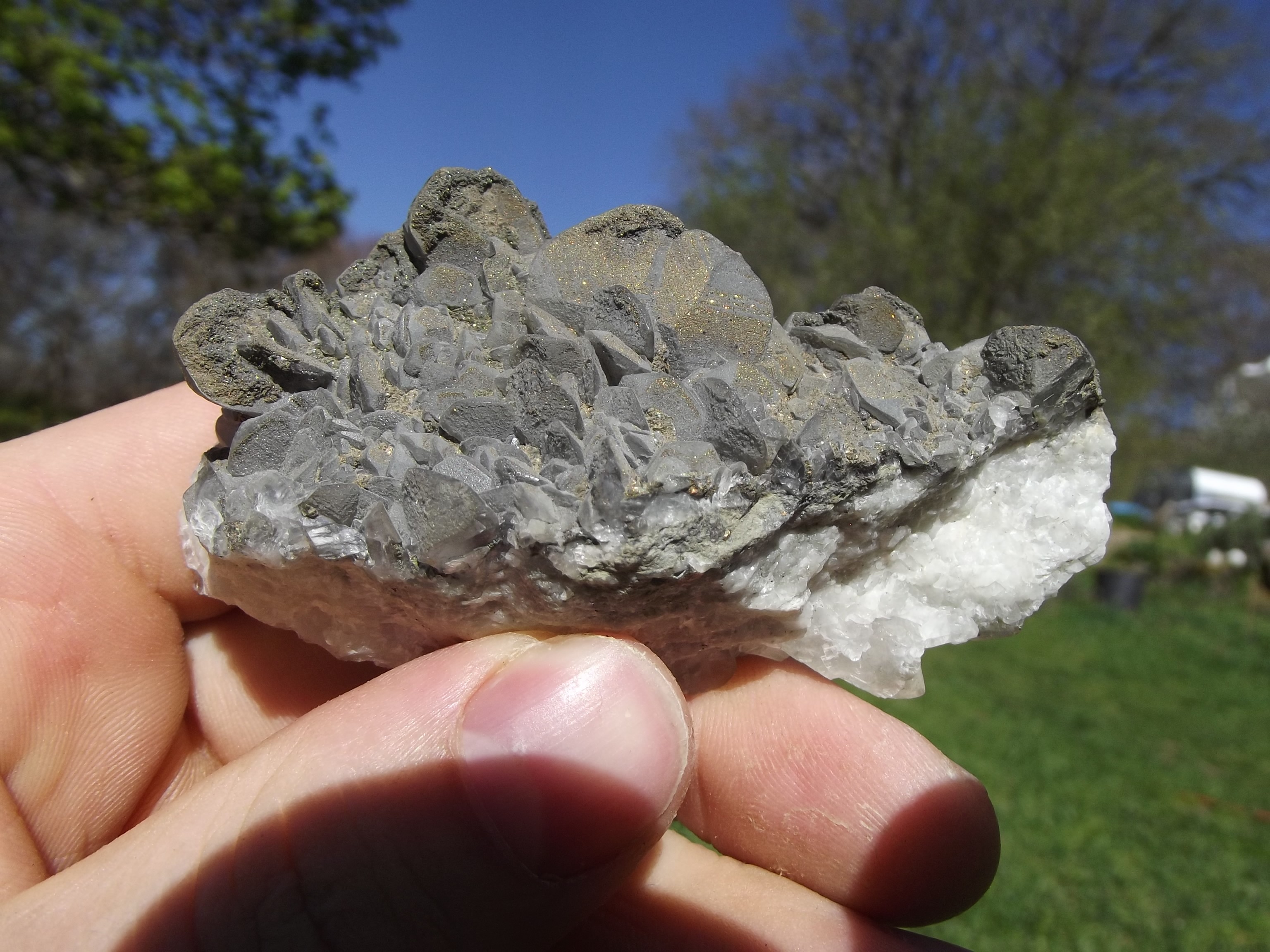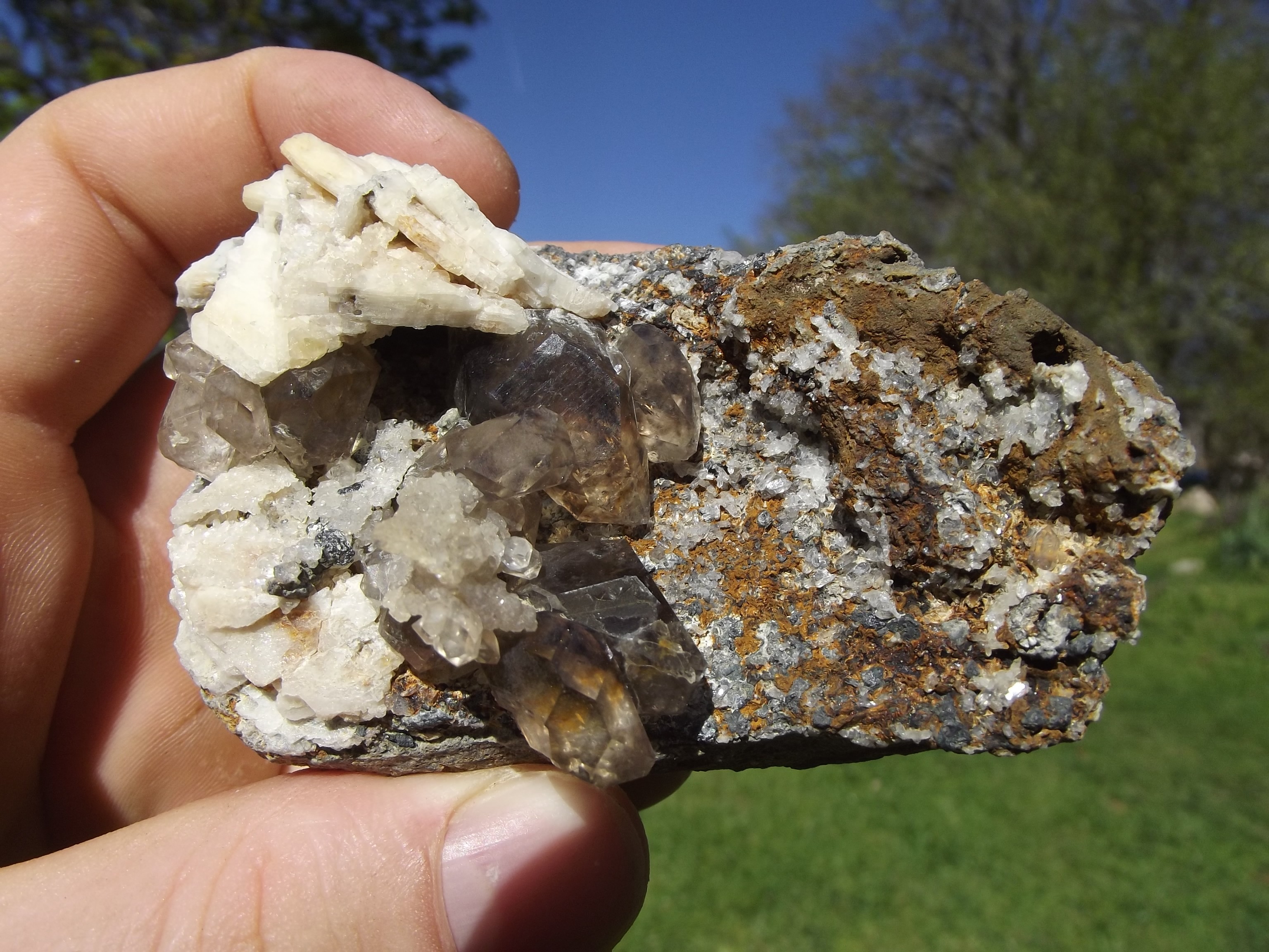 Calcite sur sphalérite, les Cèdres Une autre Tetraédrite sur baryte des Cèdres, avec des coulures rouille dues à l'altération de la tétraédrite -