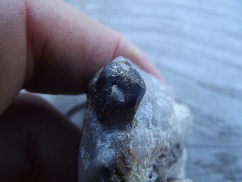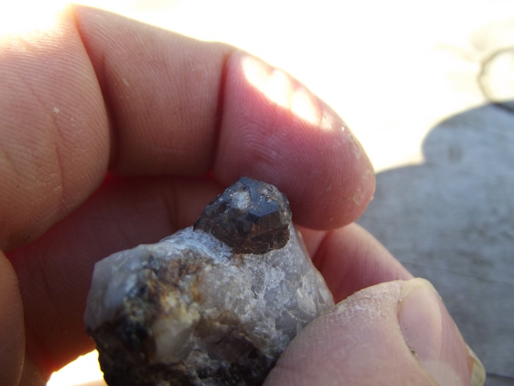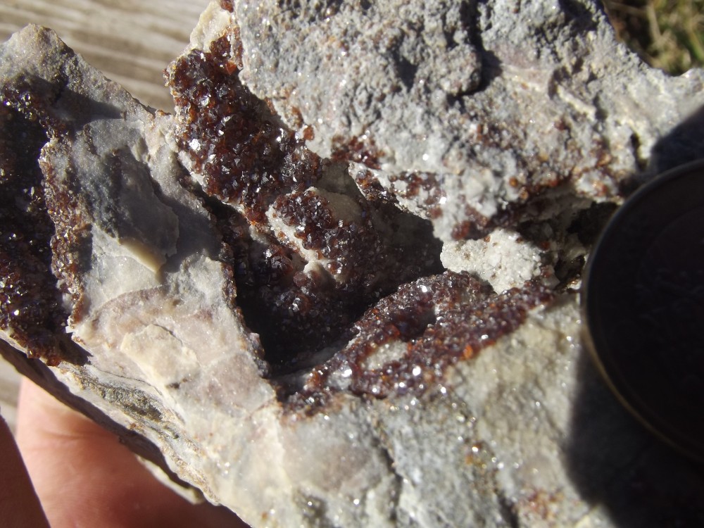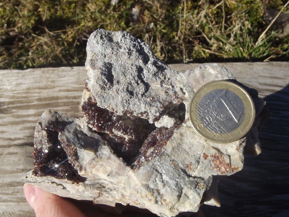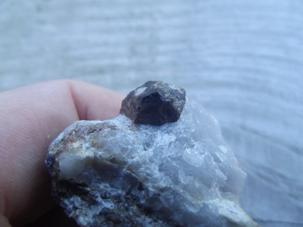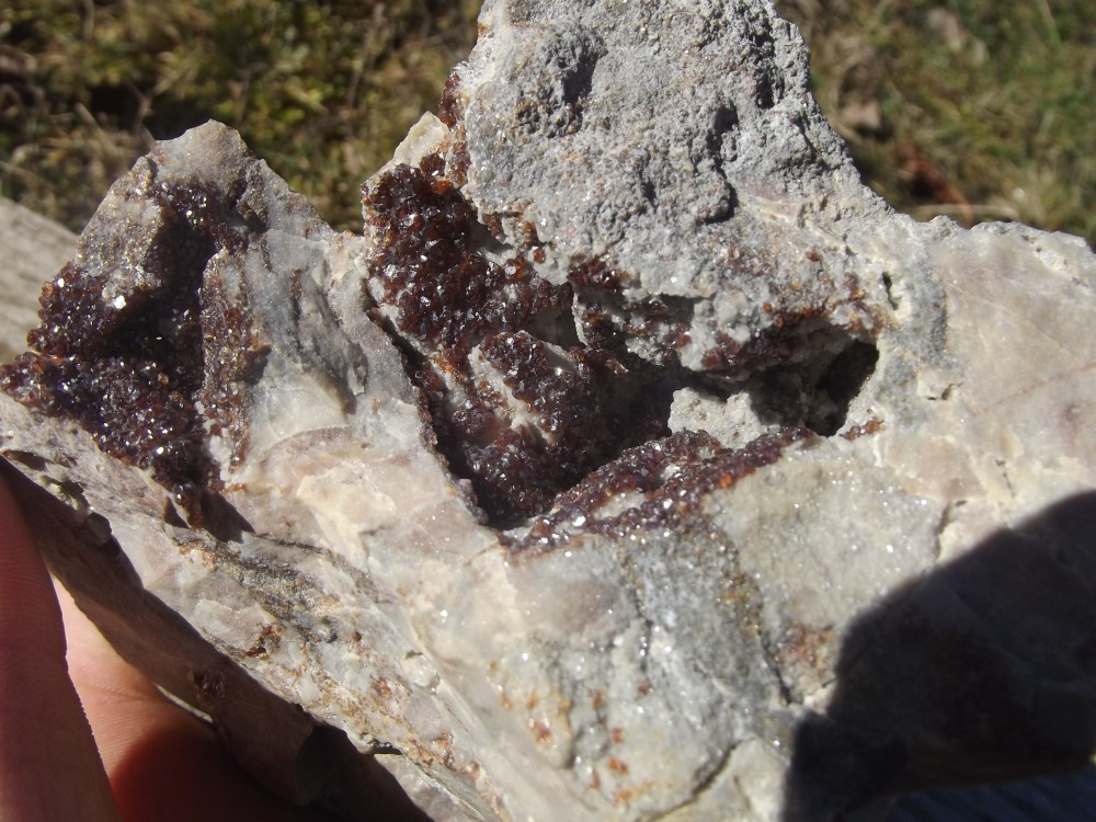 Merci, pour Laurent : trouvé sur la fin de la sortie, tu vois le puis (à côté du jardin). Pour @grenat66, trouvé dans du quartz massif en recassant un échantillon à cassis en sections, il y était presque entièrement pris dans le quartz, juste une partie était visible sur le cassure, aucunement géodique. Dégagée avec tes burins au tungstène, à peu près trois heures de travail. -