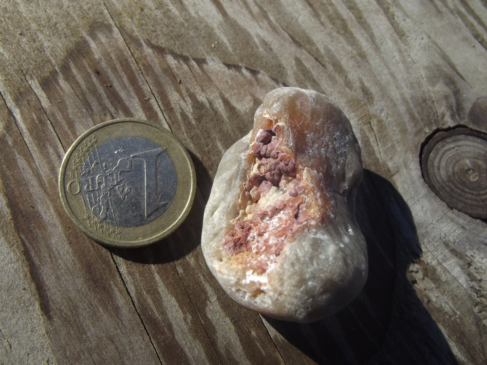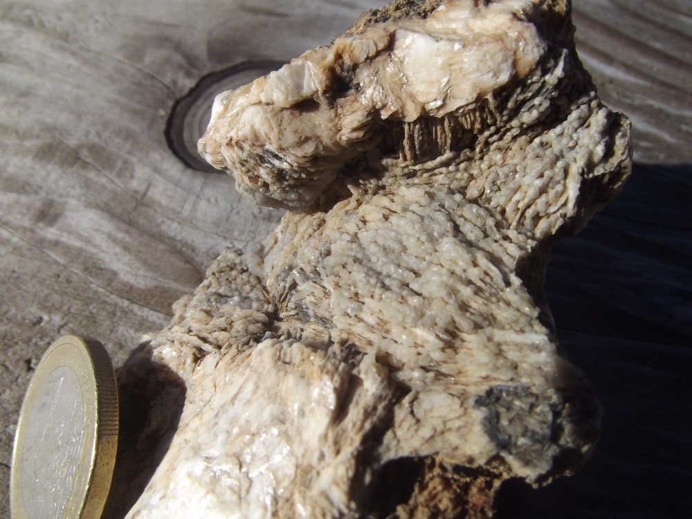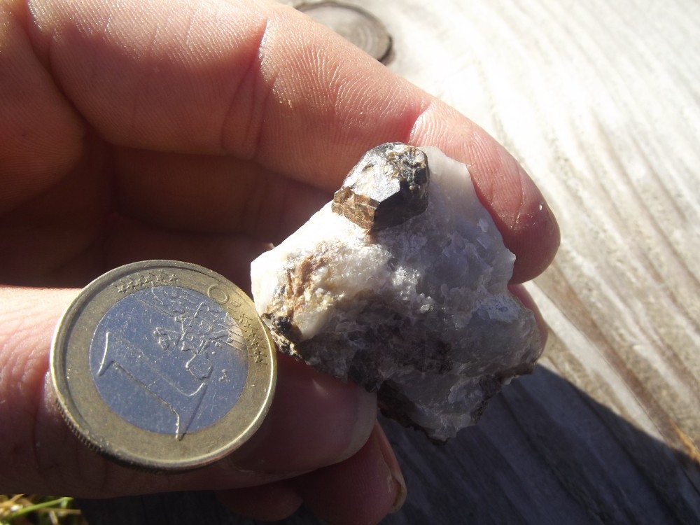 Nouvelles toutes récentes d'hier : j'ai enfin trouvé en place la pegmatite qui à donné les béryls et autres minéraux du dernier post (au moins en partie, car cette zone (environ 1 km²) est un ensemble d'un fouillis de petits filons), jolis béryls contenus. Puissance d'un peu plus de dix cm. Minéraux trouvés pour l'instant dans cette peg : muscovite, biotite, feldspaths et béryls sur les côtés, laissant un espace de 5-6 cm rempli de quartz, remplissage classique dans les pegmatites du secteur (contenant 4 communes pour l'instant) dont les plus grosses doivent attendre le mètre de puissance (observation dans des blocs erratiques). En 3h j'ai du décaper une zones de 30 par 30 cm de filon, avec pointerole manganèse vanadium et massette, en tapant comme un malade, donc autant dire que ce n'est pas très efficace ... On va donc probablement y aller au perfo. Bonne nouvelle : les béryls sont très fréquents, une dizaine dans 30 cm3 et une petite géode à quartz à déjà été trouvée.