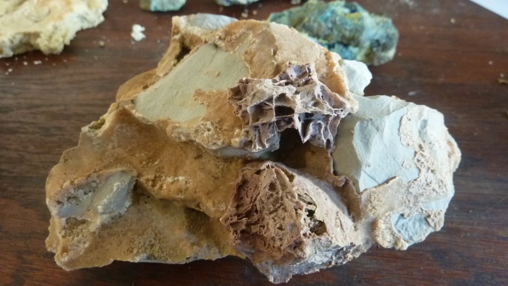 17. Bonjour Trouvées à 1000 mètres à vol d'oiseaux de la mine des Malines (Montdardier ou st Laurent le minier, je sais pas trop comment il faut dire) .....sur le site énormément de roches agglomérées par la calcite.Piéce telle qu'elle aucun nettoyage ,plus tard je pense la tremper dans la dithio pour voir .... Pourriez vous me dire le nom de ce minéral merci