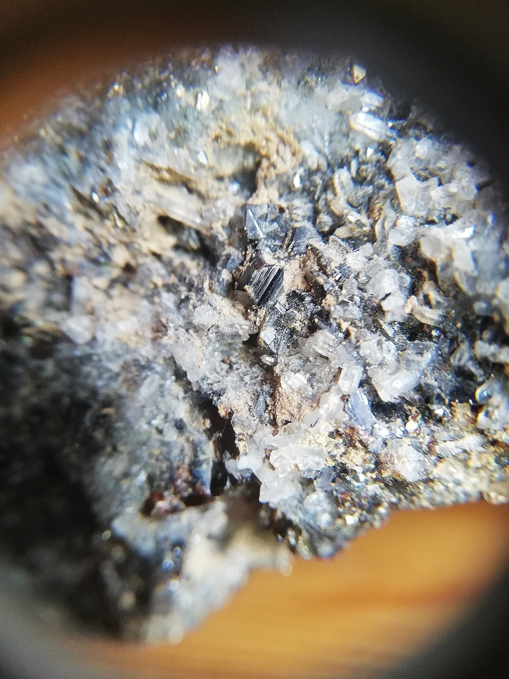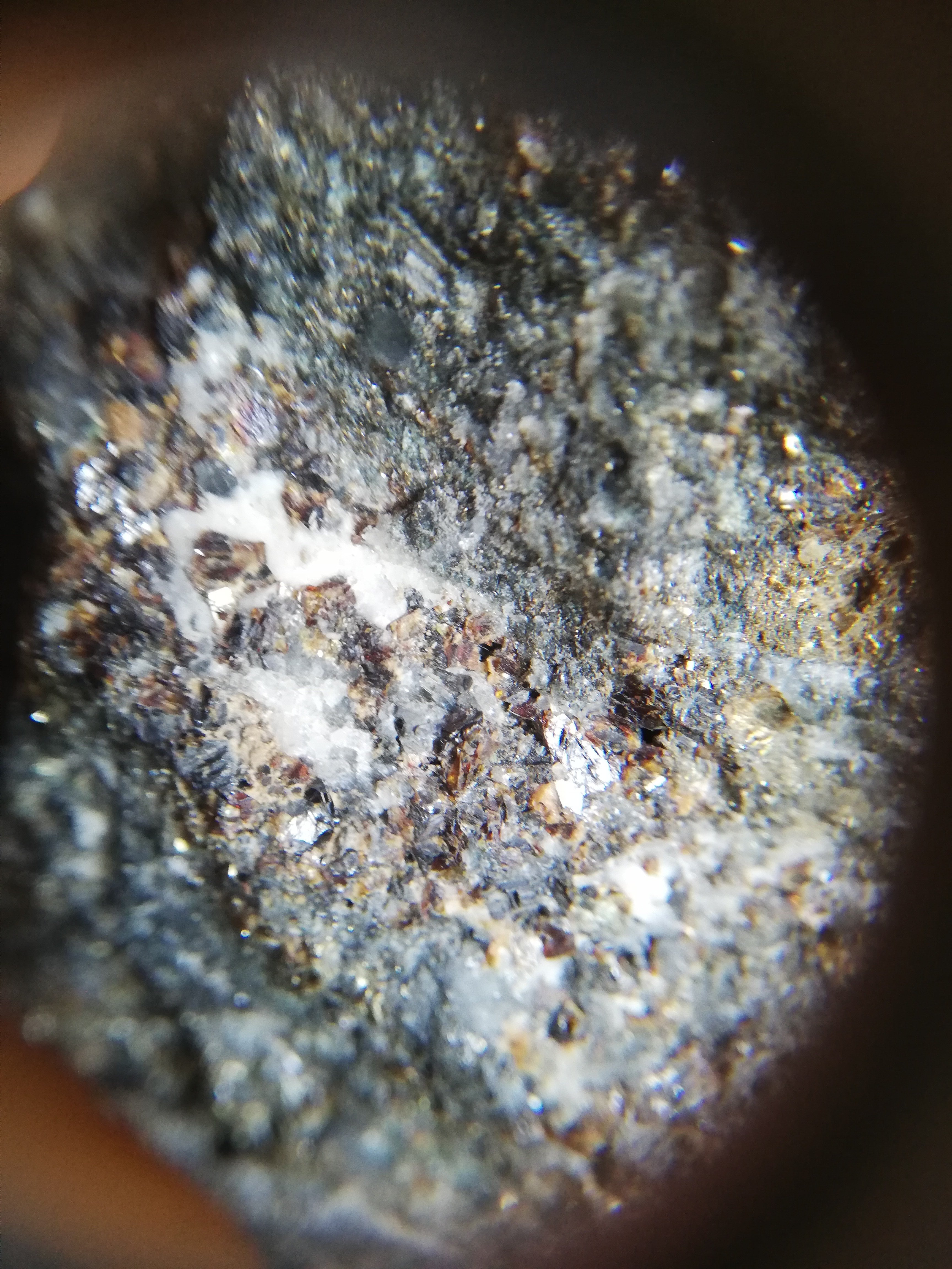 Bonjour à tous ! Récemment un prof de fac m'a filé une roche très sympathique, je n'en connais pas du tout l'origine malheureusement. C'est une roche certainement utilisable pour l'extraction de cuivre ou encore de plomb ou même d'or ! Pour ce que j'ai réussi à identifier on y trouve de la chalcopyrite, de la pyrite, de la galène, de la malachite ainsi que des petites quantités d'or natif. La roche est percée de veines dans lesquels ont dû circuler des fluides hydrothermaux puisque on y trouve du quartz ainsi que de la calcite. Je n'arrive cependant pas à identifier certains minéraux sur cette roche. Sur la première photo, il s'agit de ces espèces de cristaux pyramidaux noirs, très probablement métalliques; on ne les trouvent que sur les zones avec du quartz. Sur l'autre photo, ce sont ces minéraux bruns-oranges. J'ai respectivement pensé à la sylvanite (Ag,Au)Te2 et la sphalérite ZnS mais j'ai des doutes X).En espérant que vous puissiez m'éclairer ! PS : désolé pour la qualité des photos, j'ai dû les faire à l'aide de ma loupe de géologie.