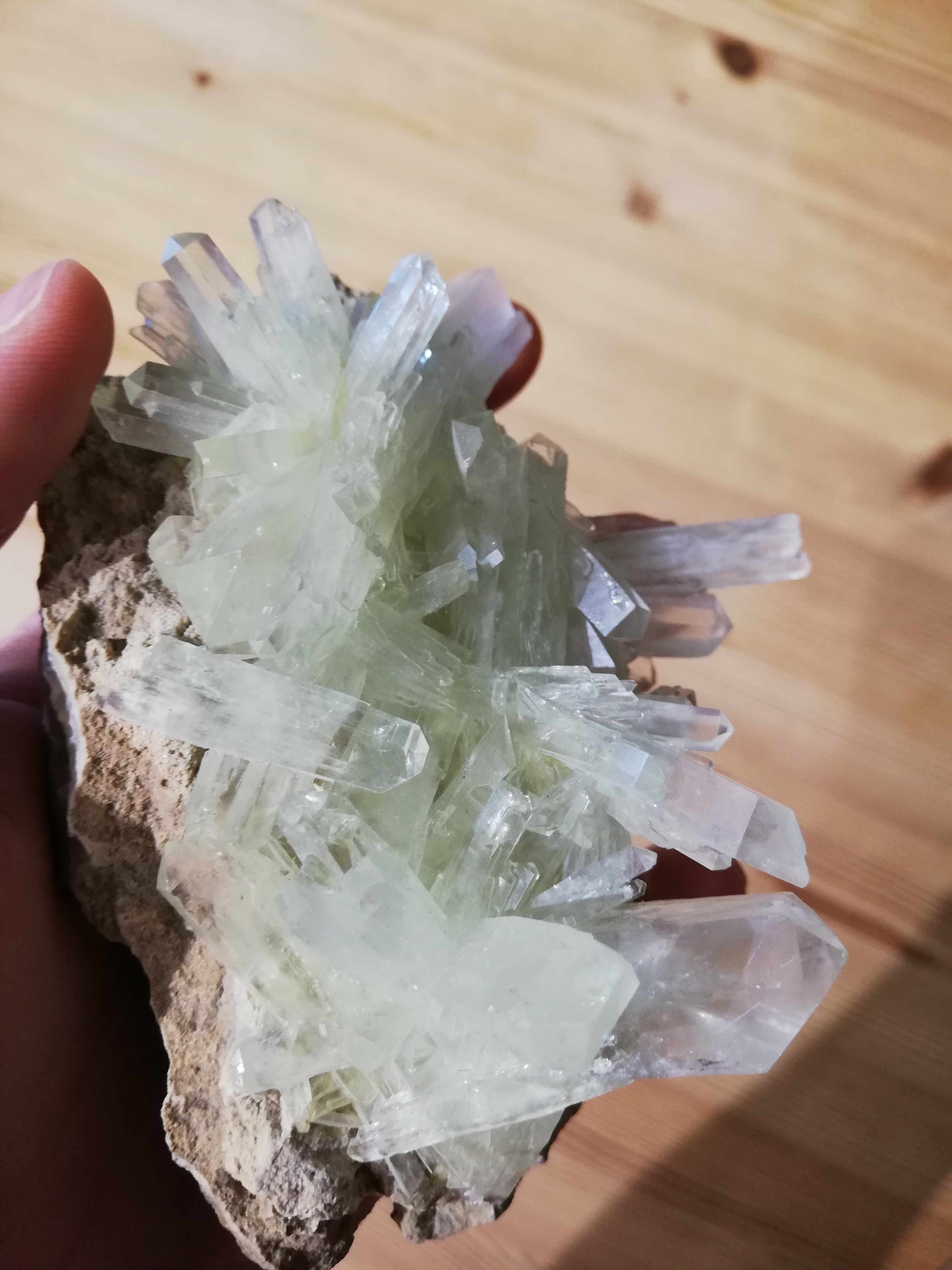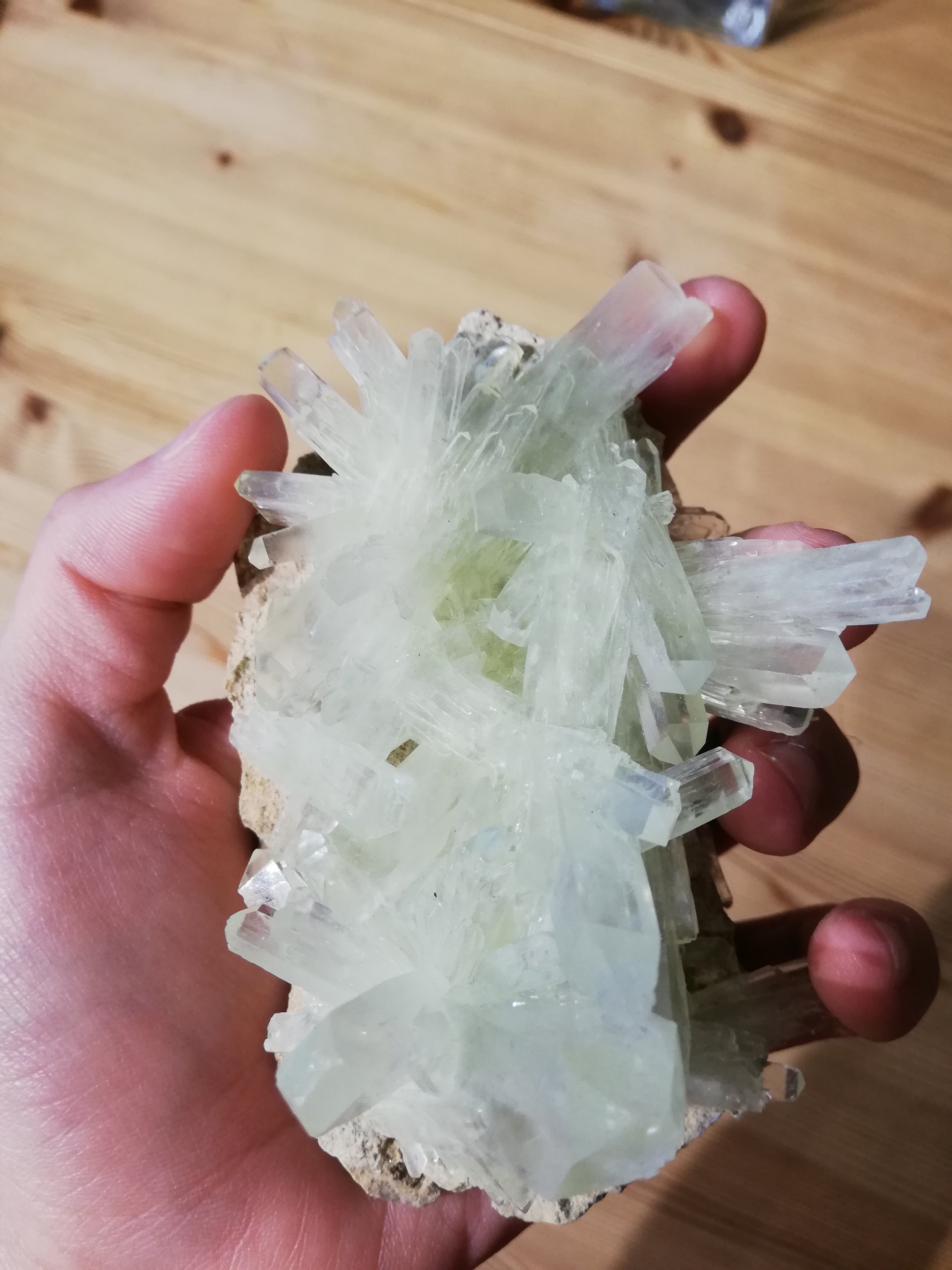 Bonsoir à tous, j'ai un spécimen qui n'a pas d'origine connu hérité de ma grand mère. Je pensais il y a encore peu qu'il s'agissait de quartz ! Il s'agît en réalité de Natrolite, je l'ai montré à d'autres collectionneurs et certains ont évoqués l'idée que les cristaux proviendraient de laboratoire. Je m'en remet donc à ceux qui connaissent bien les zéolites pour m'éclairer sur cette question qui je l'admet est assez compliqué ! J'ai réalisé d'autres test sur ces cristaux : ils se cassent très facilement et lorsqu'ils sont mis sous la flamme d'une allumette, les cristaux "explosent". -
