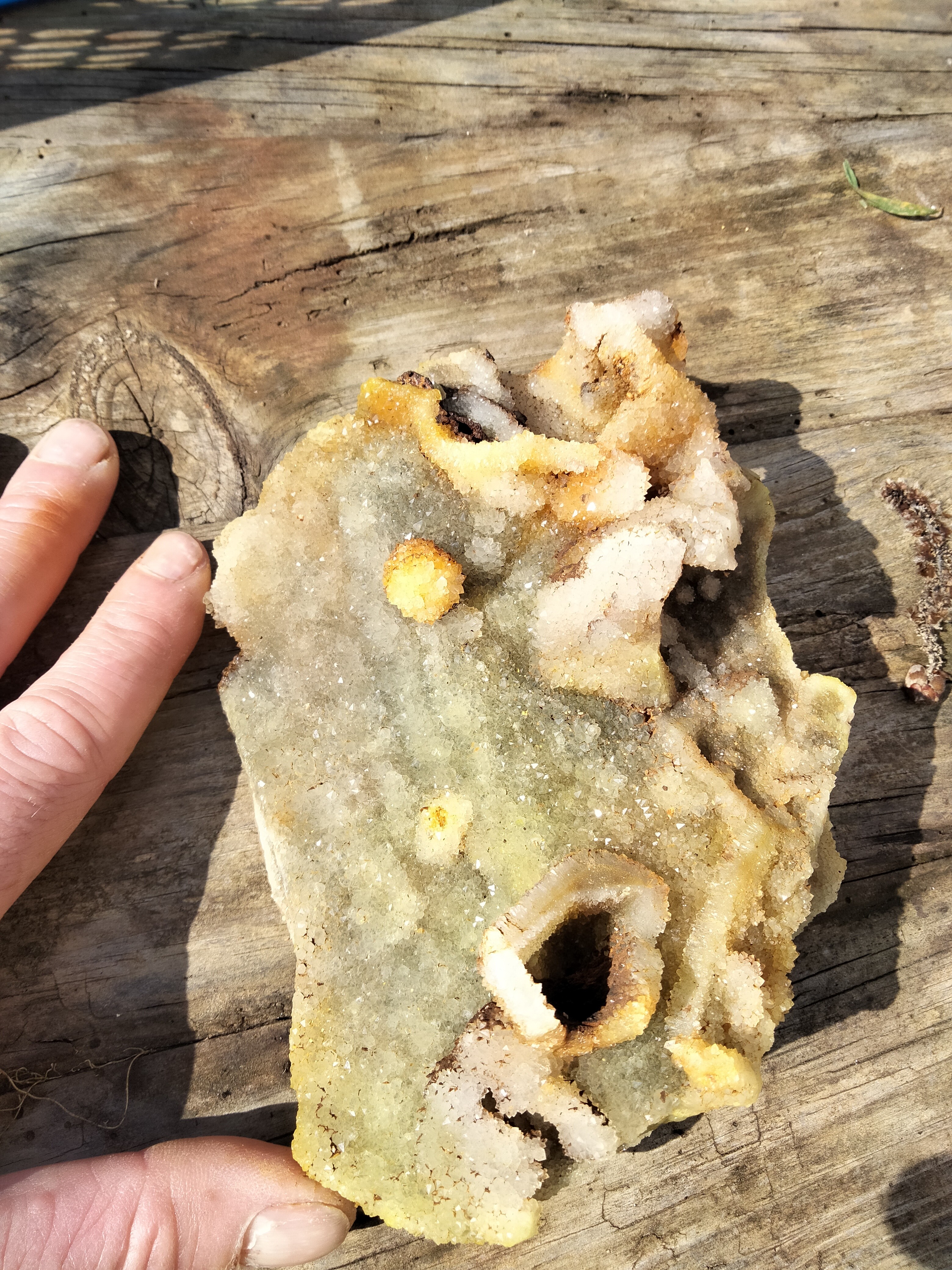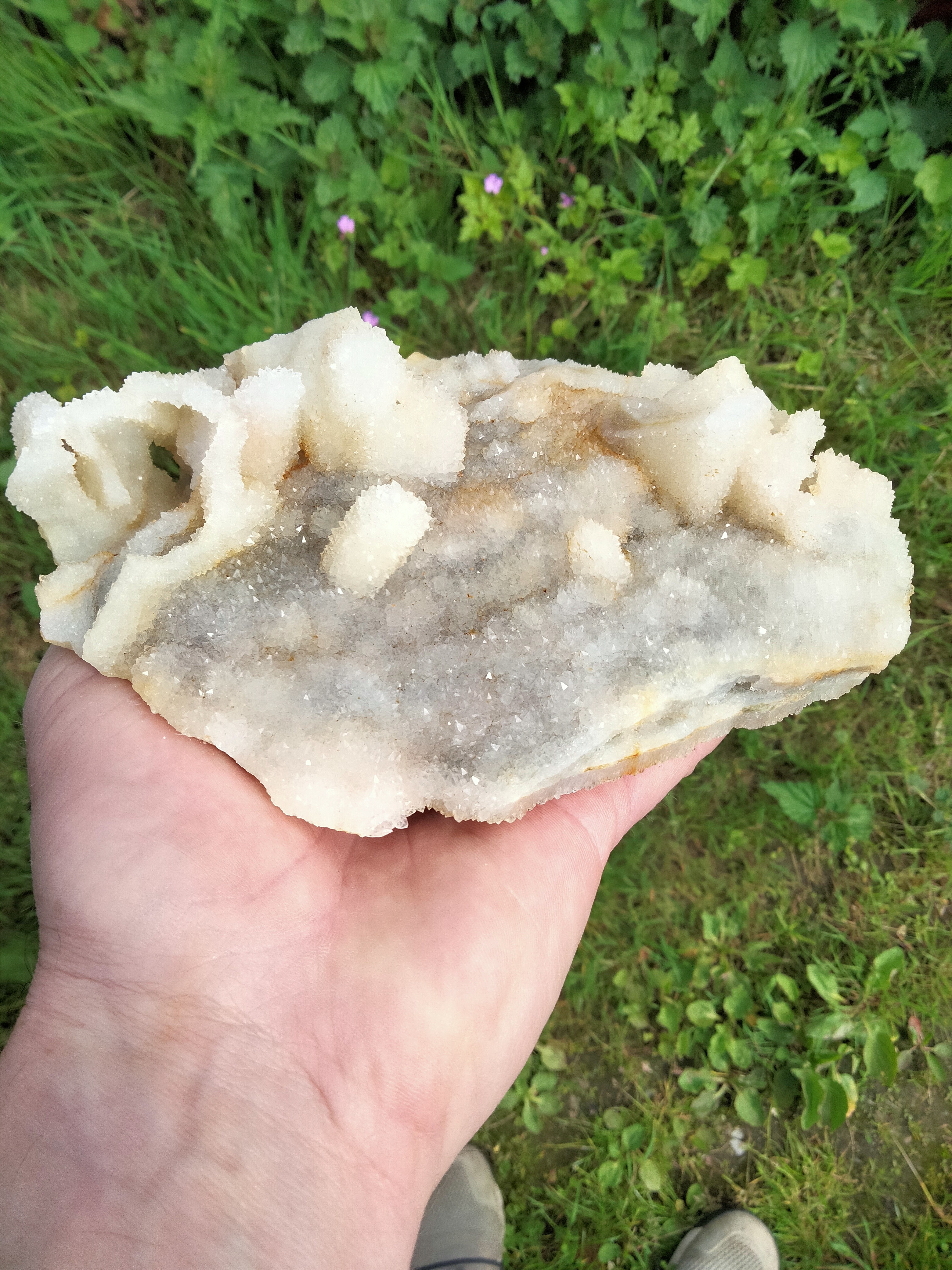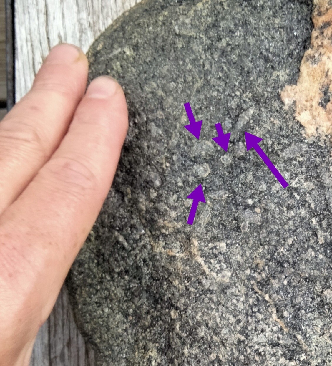 Le minéral rose sous mon pouce à une dureté légèrement supérieure à celle du quartz (sur les parties plates, c'est le quartz qui s'use, mais sur une arrête, le minéral s'use un peu où se cassé peut être ?).
